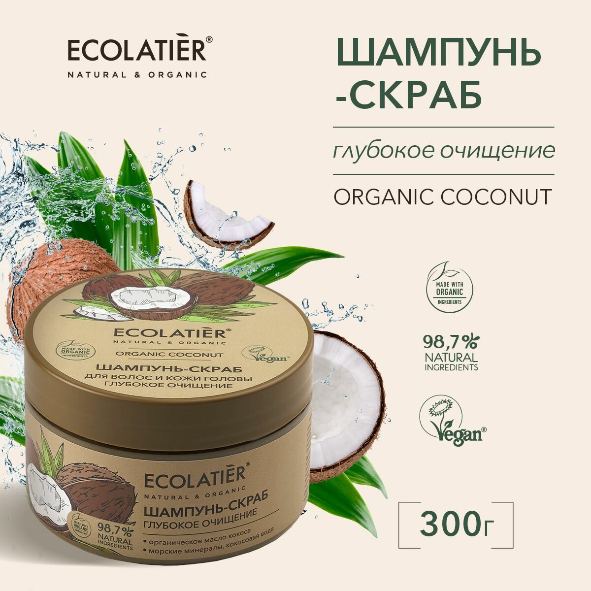 Шампунь-скраб для волос и кожи головы Organic Coconut Глубокое Очищение 300г Ecolatier
