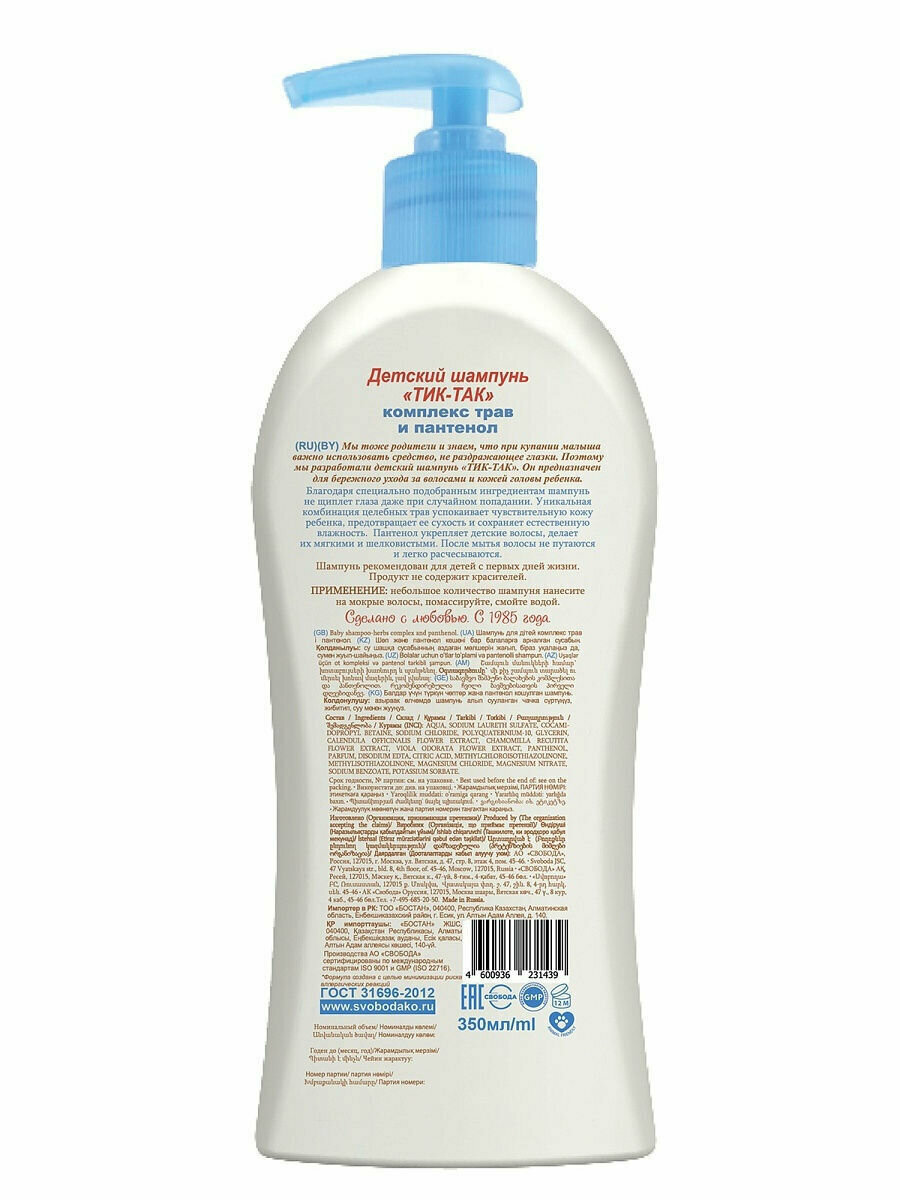 Детский шампунь Тик-Так комплекс трав и пантенол. Он предназначен для бережного ухода за волосами и кожей головы ребенка. Благодаря специально подобранным ингредиентам шампунь не щиплет глаза даже при случайном попадании. Уникальная комбинация целебных трав успокаивает чувствительную кожу ребенка, предотвращает ее сухость и сохраняет естественную влажность. Пантенол укрепляет детские волосы, делает их мягкими и шелковистыми. После мытья волосы не путаются и легко расчесываются. Шампунь рекомендован для детей с первых дней жизни. Продукт не содержит красителей.