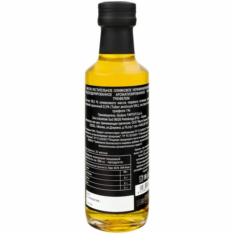 | Состав | оливковое масло первого отжима (98,5%), трюфель черный сушеный (0,5%), экстракт черного трюфеля (1%) |