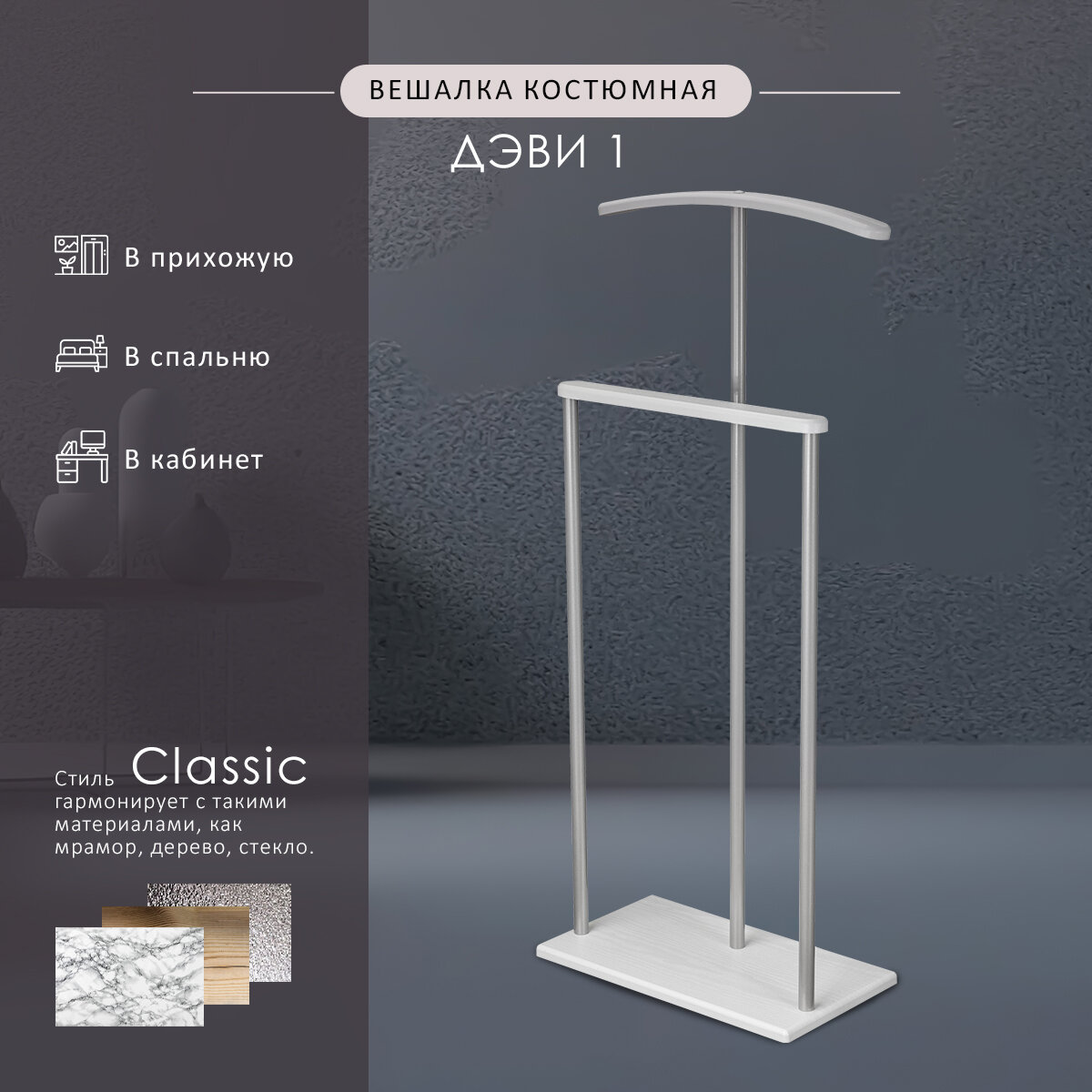 Вешалка Дэви 1 – идеальное место для отпаривания и хранения костюма. Плечики отлично подходят под пиджак, а брюки или юбку располагайте на перекладине. Функциональный предмет мебели будет удачно смотреться в гардеробной зоне спальни или прихожей. Собирайте ваш образ заранее, чтобы сэкономить время и силы утром.