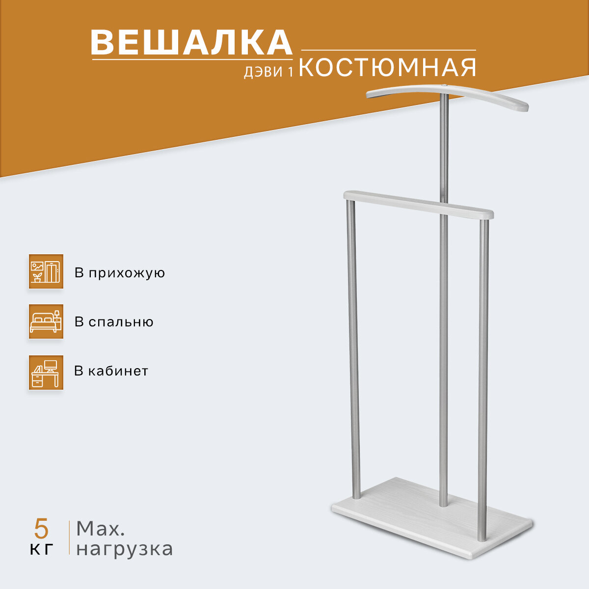 Костюмная вешалка Дэви 1 – это неотъемлемая часть гардероба, которая поможет поддерживать порядок и сохранять опрятный вид вещей. Основание надежно стоит на полу, а три металлические стойки обеспечивают прочность и устойчивость. Деревянные элементы выполнены из МДФ и покрыты пленкой, имитирующей древесину. Конструкция легко собирается.