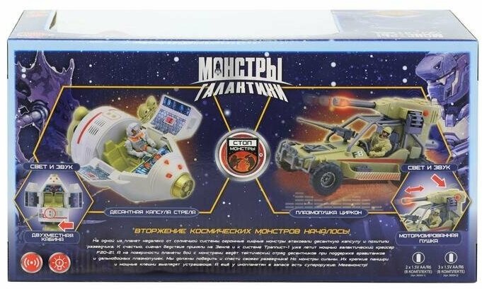 В игровой набор входит: мобильная плазмопушка 25 см, фигурка солдата 10 см с подвижными руками, ногами и головой, личное оружие, планшет, переносной ретранслятор, канистра. 3 батарейки АА включены в набор.
