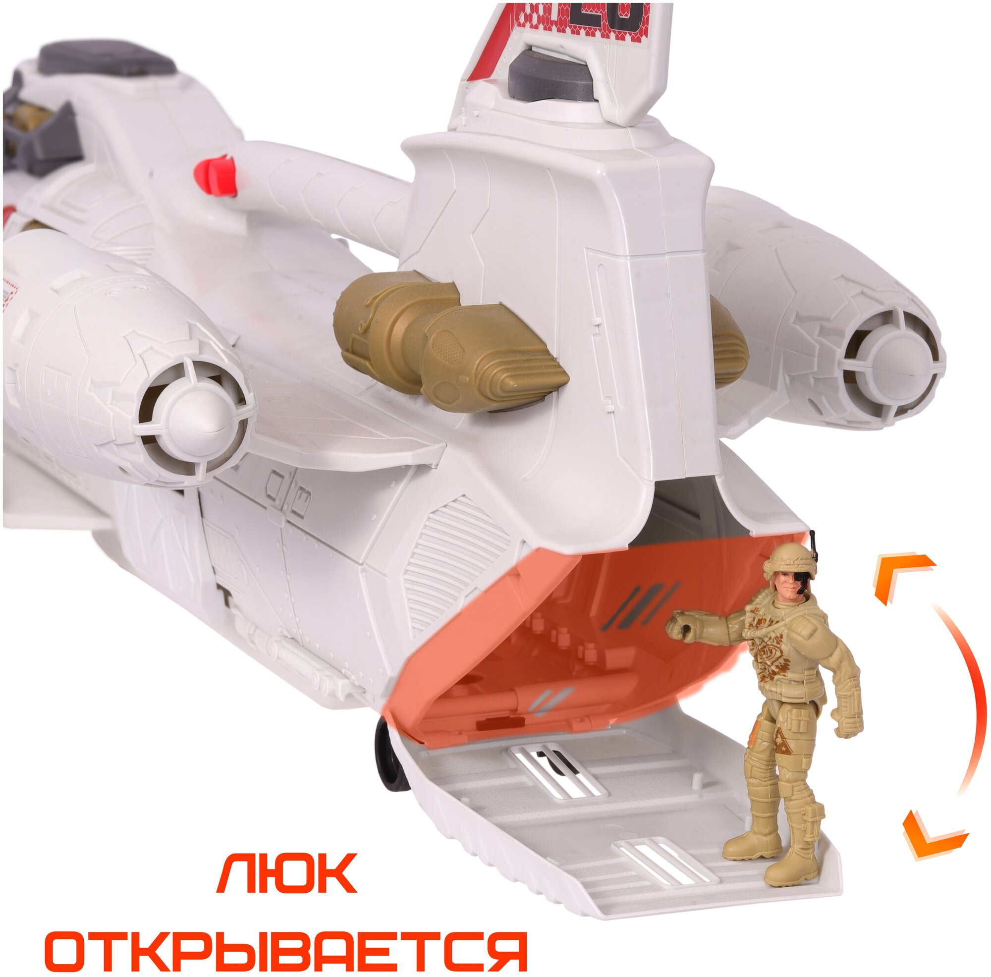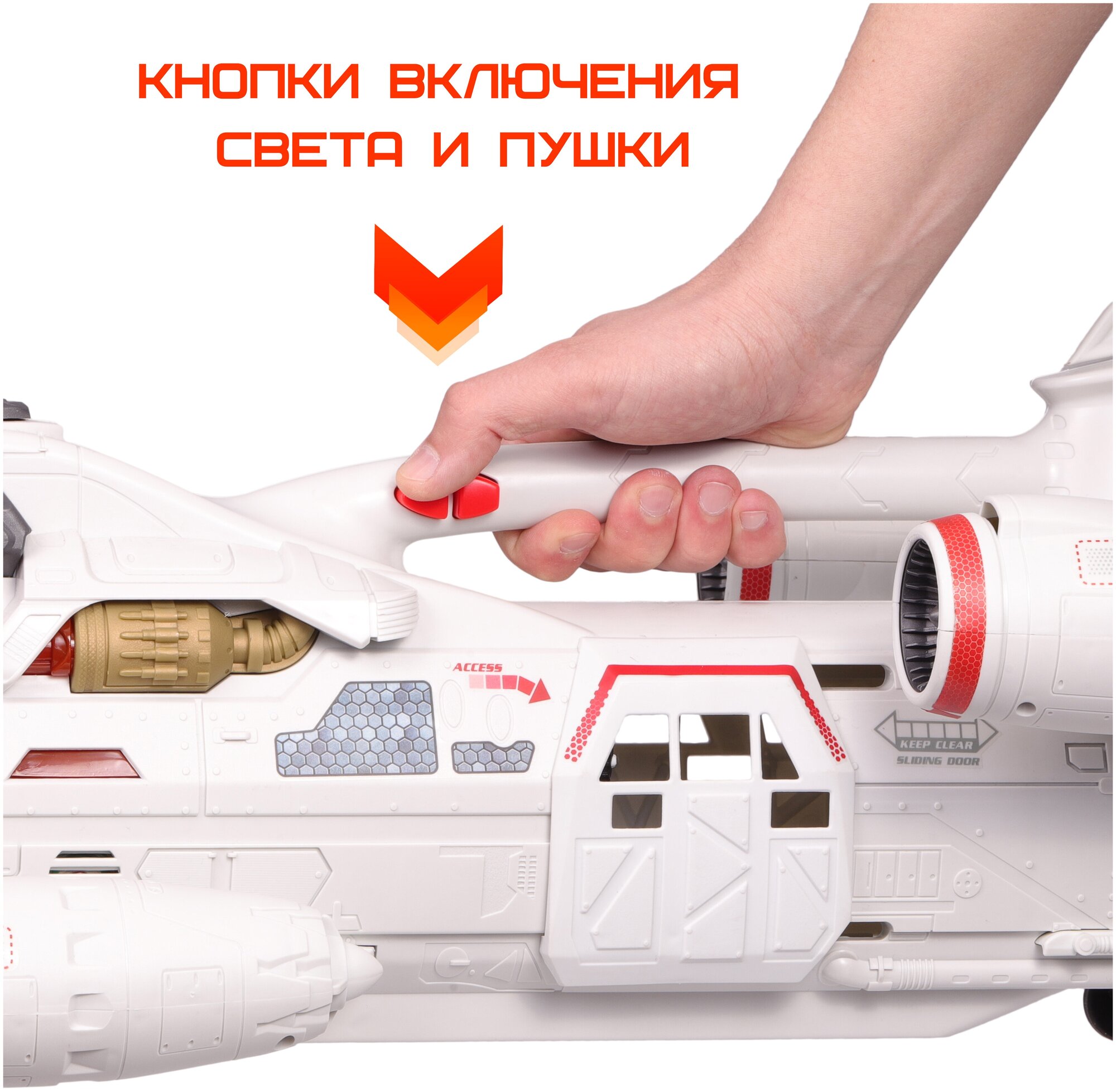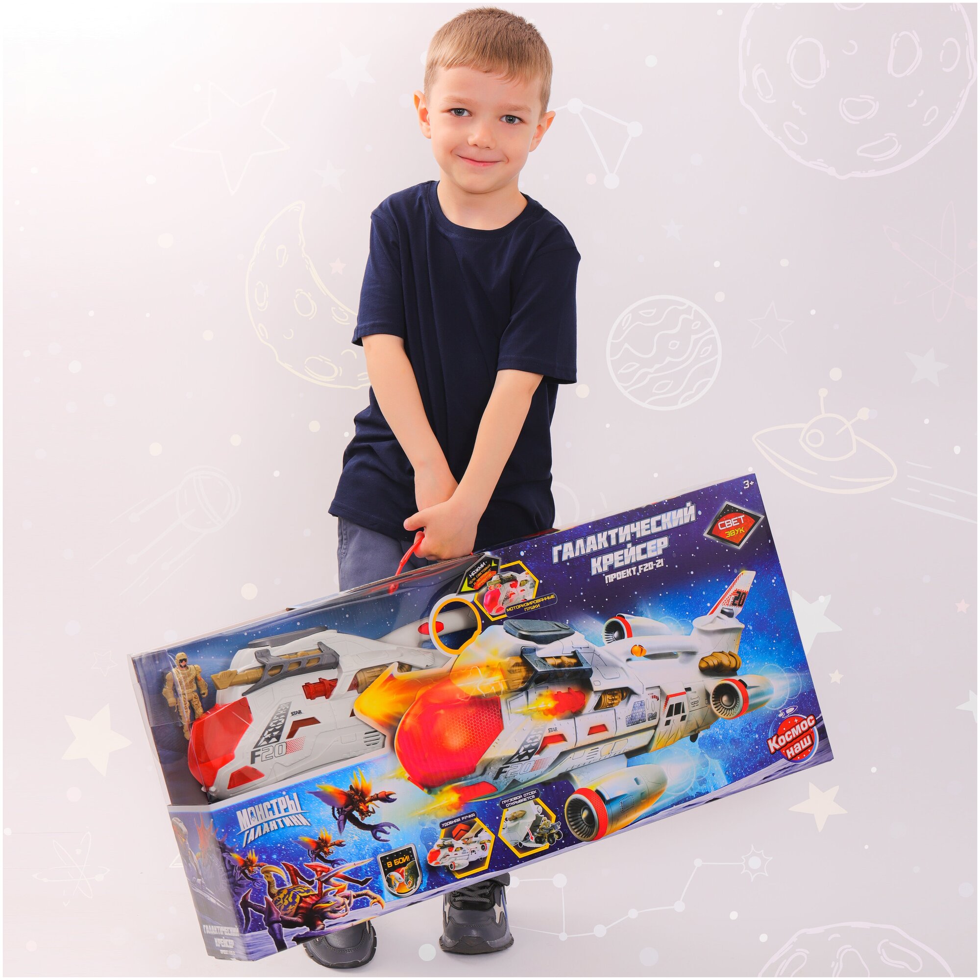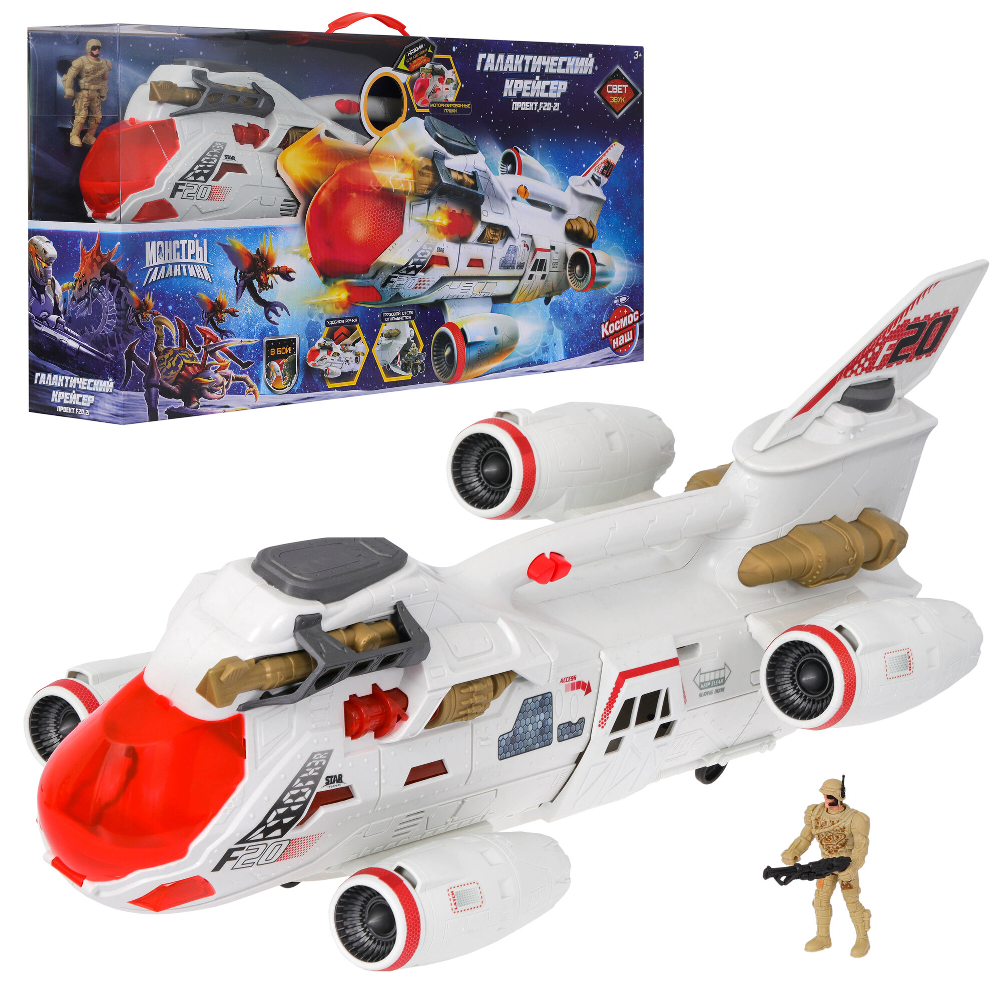 В игровой набор входит: галактический крейсер 68 см, фигурка солдата 10 см с подвижными руками, ногами и головой. 3 батарейки АА включены в набор.