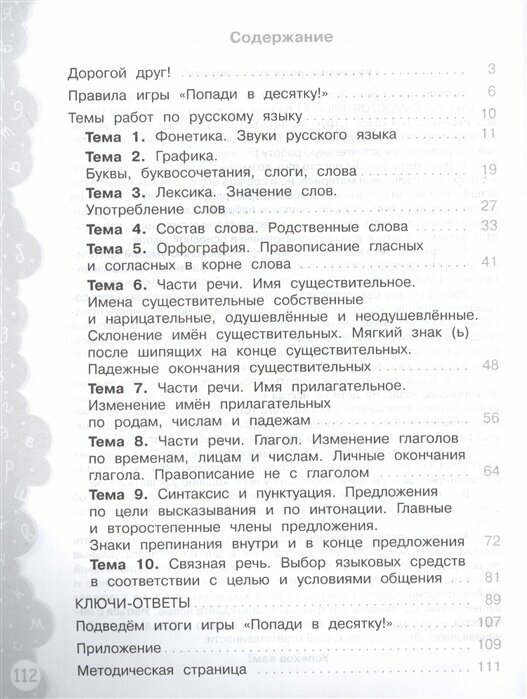 Учебное пособие "Попади в десятку! Русский язык. 4 класс" предназначено для систематизации знаний и отработки умений обучающихся 4 класса общеобразовательных организаций по основным разделам курса: "Фонетика. Звуки русского языка", "Графика. Буквы, буквосочетания, слоги, слова", "Лексика. Значение слова", "Состав слова", "Орфография", "Части речи", "Синтаксис и пунктуация".