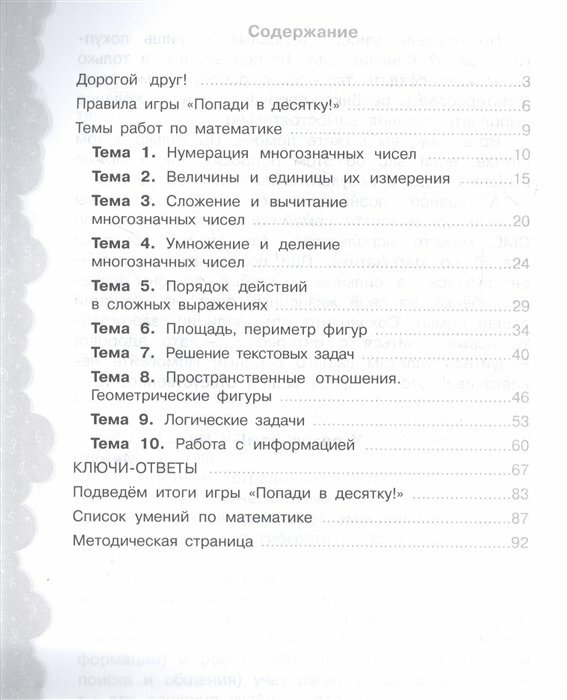 Учебное пособие "Попади в десятку! Математика. 4 класс" предназначено для систематизации знаний и отработки умений обучающихся 4 класса общеобразовательных организаций по основным разделам курса математики: "Числа и величины", "Арифметические действия", "Работа с текстовыми задачами", "Пространственные отношения. Геометрические фигуры", "Геометрические величины", "Работа с информацией".
