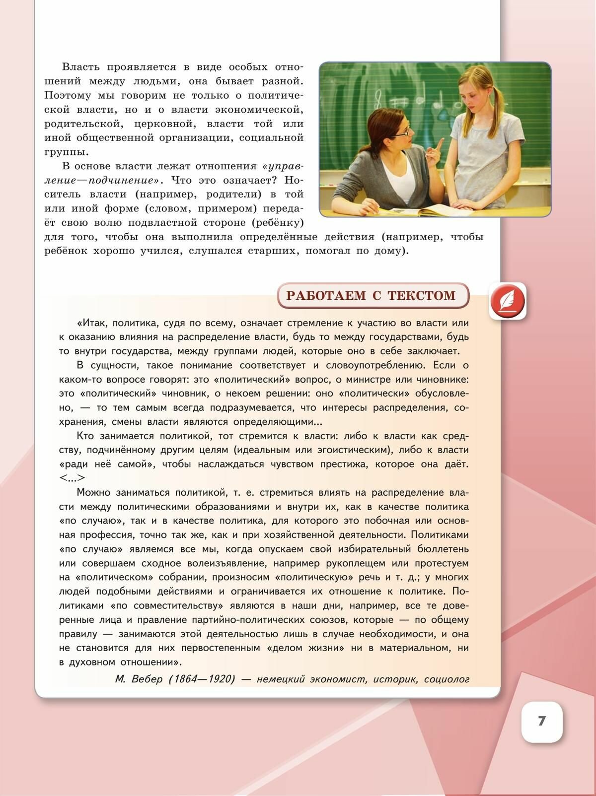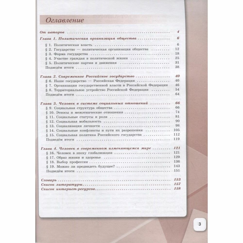 Учебник познакомит школьников с политической организацией общества, основными формами государства и особенностями административного и политического устройства Российской Федерации. С учётом возрастных особенностей учащихся в учебнике рассматриваются вопросы структуры общества, социальных конфликтов и путей их разрешения. Особое внимание в учебном тексте уделено положению человека в эпоху глобализации, затрагиваются вопросы здоровья, образа жизни и дальнейшего выбора профессии.