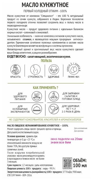 Кунжутное масло производится по фирменной технологии из самого свежего отборного сырья. Его сбалансированный состав включает в себя огромное количество полезных и даже жизненно необходимых человеку веществ. Это масло – частая составляющая спортивной или медицинской диеты. Впрочем, оно пригодится в любом доме, где придерживаются здорового и качественного питания! Вот его основные составляющие: Комплекс жирных кислот, идеально сбалансированный природой. Олеиновая, пальминтовая, линолевая и другие (всего около десяти) полиненасыщенные жирные кислоты в обязательно порядке должны поступать в наш организм «со стола». Их недостаток ведет к неминуемому сбою практически во всех системах жизнедеятельности. Сезамол, названный так именно в честь кунжута (второе название кунжута – сезам). Это натуральный очень сильный антиоксидант, позволяющий нивелировать неблагоприятное воздействие на организм окружающей среды. При нанесении масла на кожу, сезамол выступает естественным фильтром от пагубного ультрафиолета, сохраняя молодость кожи. Витамины, необходимые для здоровой и полноценной жизни: А, Е. Срок годности, условия хранения: 12 месяцев, при температуре от 0 до 25˚ С и относительной влажности воздуха не более 70%. После вскрытия рекомендуется хранить в прохладном и темном месте не более 3 месяцев. Состав: масло пищевое нерафинированное кунжутное 100%, первый холодный отжим Пищевая ценность на 100 г: жиры 100 г Энергетическая ценность на 100 г:3762кДж/900 ккал Способ применения: Используйте масло кунжутных семечек в кулинарии. Можно заправлять им салаты и закуски, добавлять в соусы (например, в домашний майонез), во вторые блюда. Применение возможно во всех случаях, но особенно там, где масло не требуется нагревать. Кунжутное масло имеет собственный вкус и аромат. Кунжутное масло с успехом применяется в домашней косметологии. Это настоящий эликсир красоты и молодости кожи. Масло кунжутного семени великолепно питает и смягчает кожу. При этом пользоваться им можно при любом типе кожи: увядающей, с первыми морщинками и даже проблемной.