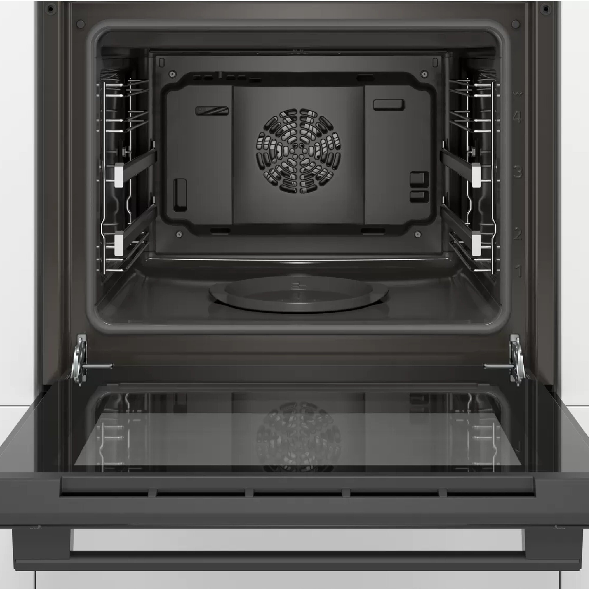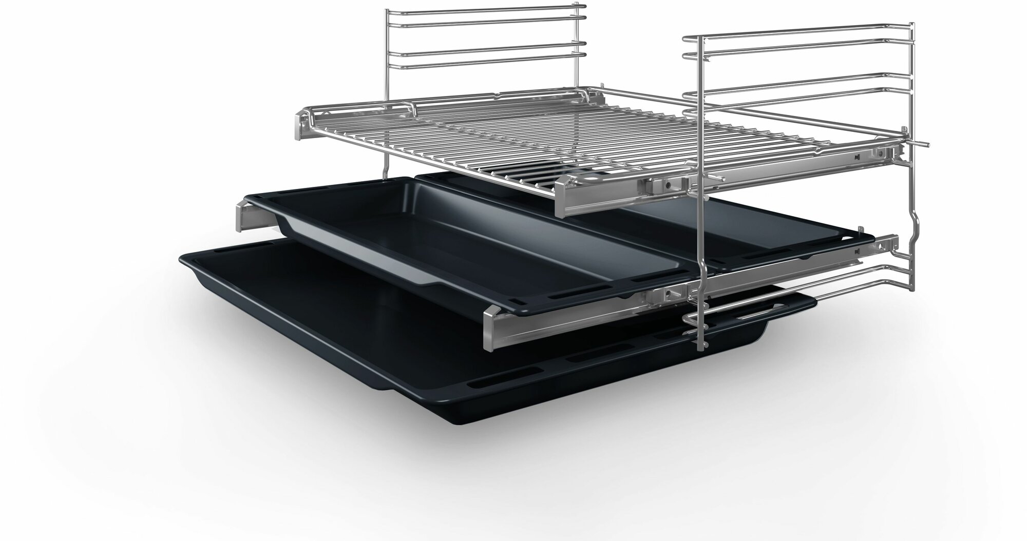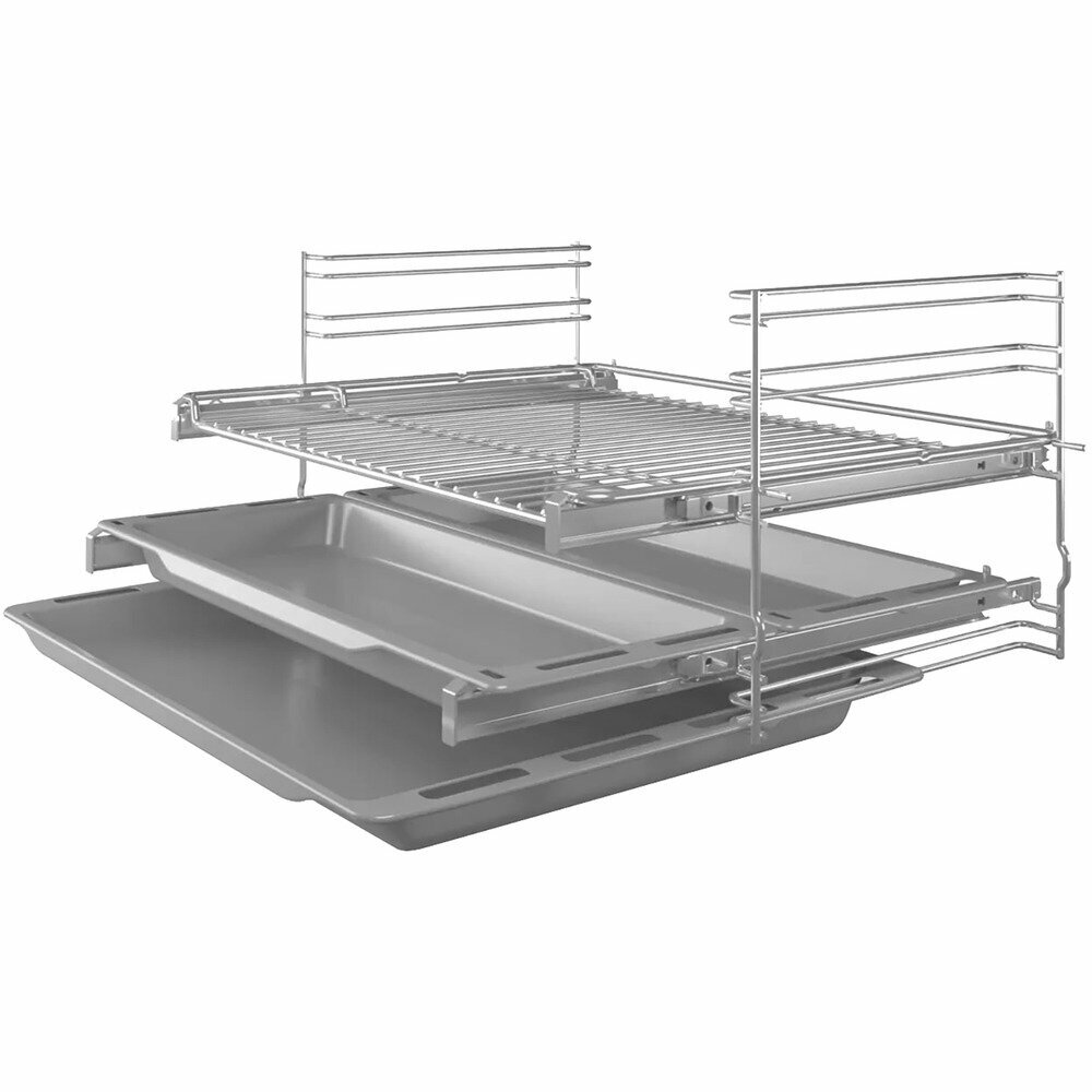 На двух уровнях расположены телескопические направляющие – ваши руки будут свободны, противни придерживать не потребуется. Дверца оснащена доводчиком SoftClose, поэтому закрывается плавно и тихо. Трёхслойное остекление не позволит духовому шкафу сильно нагреваться снаружи – в процессе работы к нему можно спокойно прикасаться. А эффективная система охлаждения даст возможность встроить эту модель в любой кухонный гарнитур.