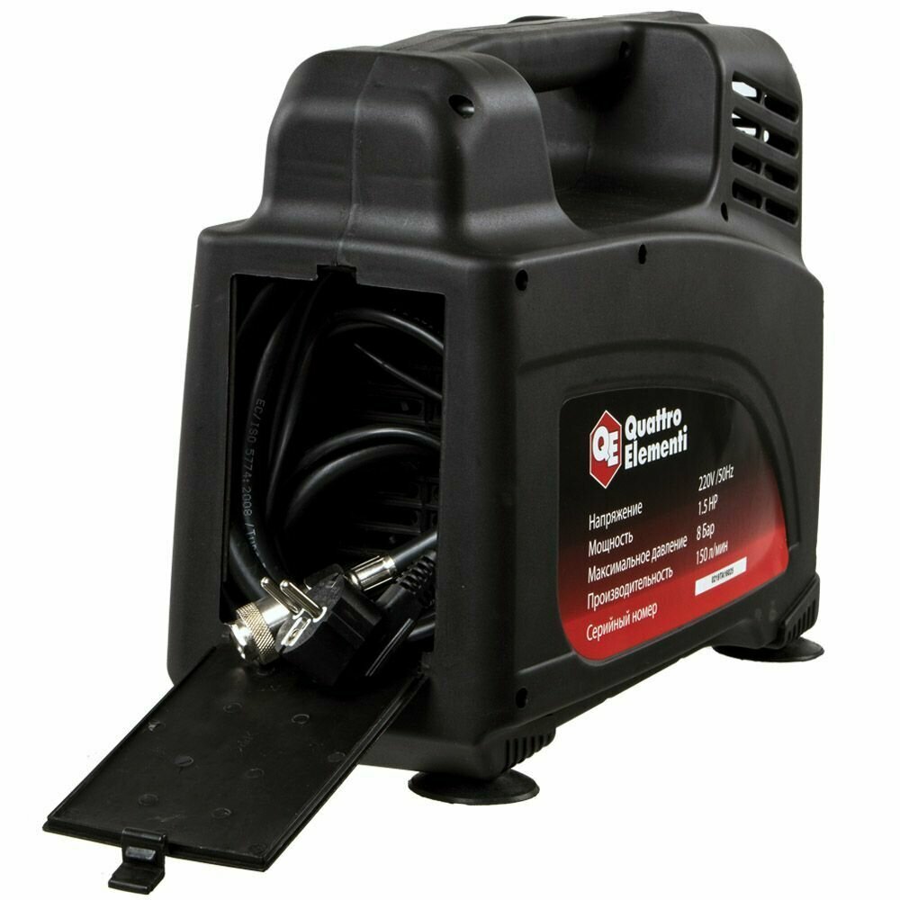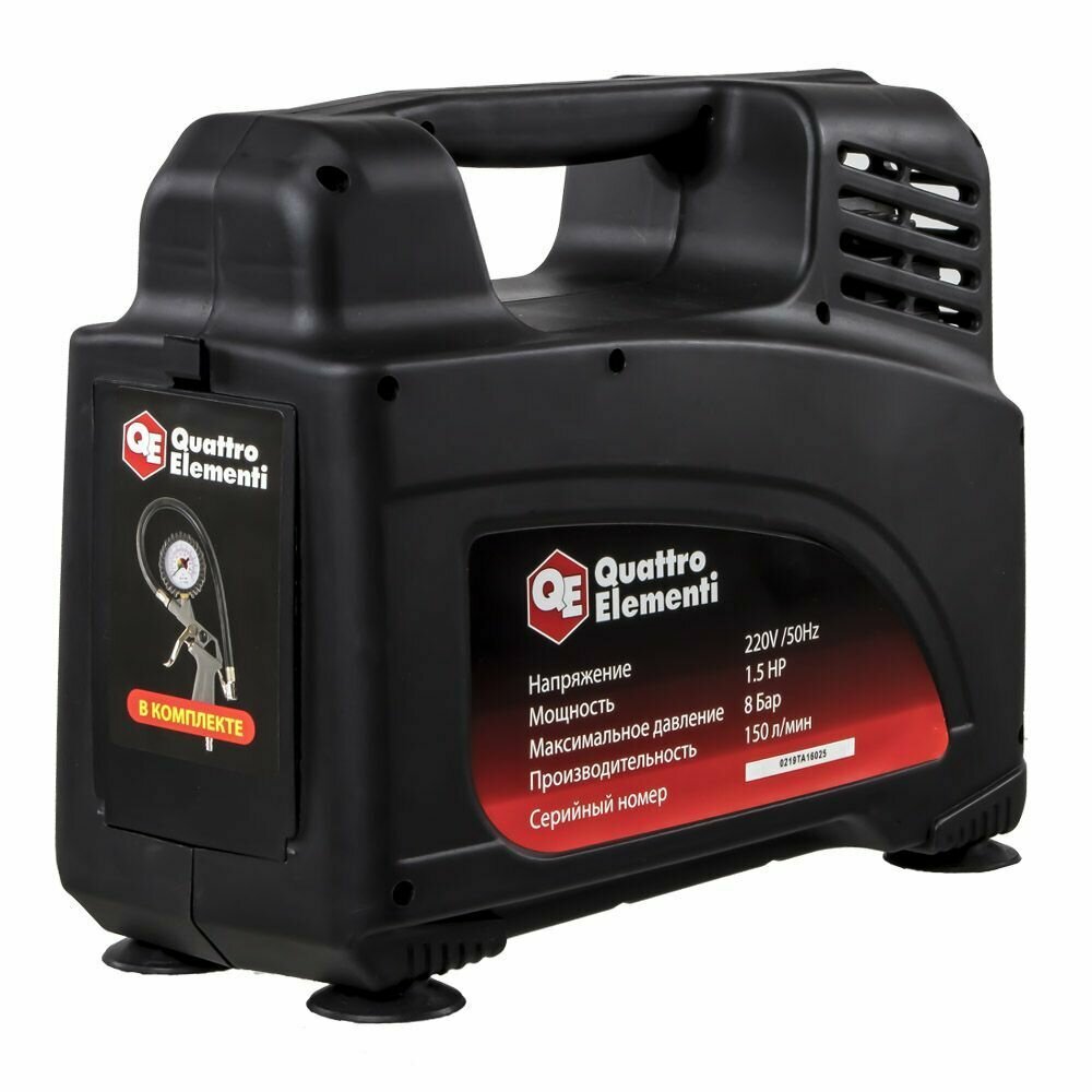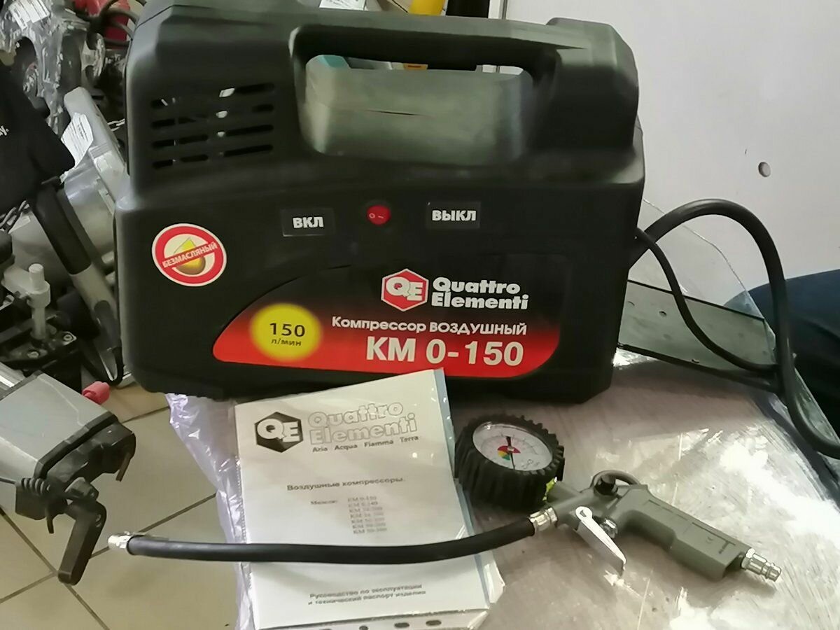 Компрессор поршневой безмасляный 919-860 QUATTRO ELEMENTI KM 0-150 ( 150л/мин, 1.5л.с, 8 бар, 9.5кг). В комплекте пистолет для накачки шин и переходники.