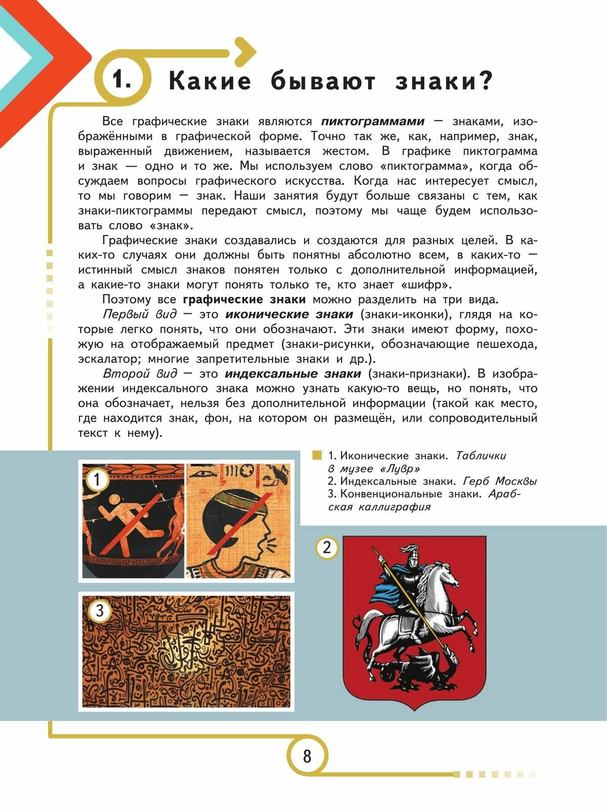 Часть 1 "Знаки и знаковые системы" знакомит со знаком как с видом коммуникации, с тремя видами знаков (иконические, индексальные, конвенциональные), их особенностями и образными возможностями.