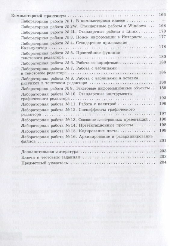 В учебнике, кроме объяснительного текста, содержится большое количество вопросов и заданий, в том числе выполняемых при помощи компьютера. Учебный материал излагается как для OC Windows, так и для OC Linux. Приводятся темы для обсуждения в группах, а также темы возможных проектов. Для закрепления пройденного материала в конце каждой главы помещены тематические тесты в формате ОГЭ. Компьютерный практикум вынесен в отдельный раздел учебника, что позволяет учителю более гибко планировать учебное время.
