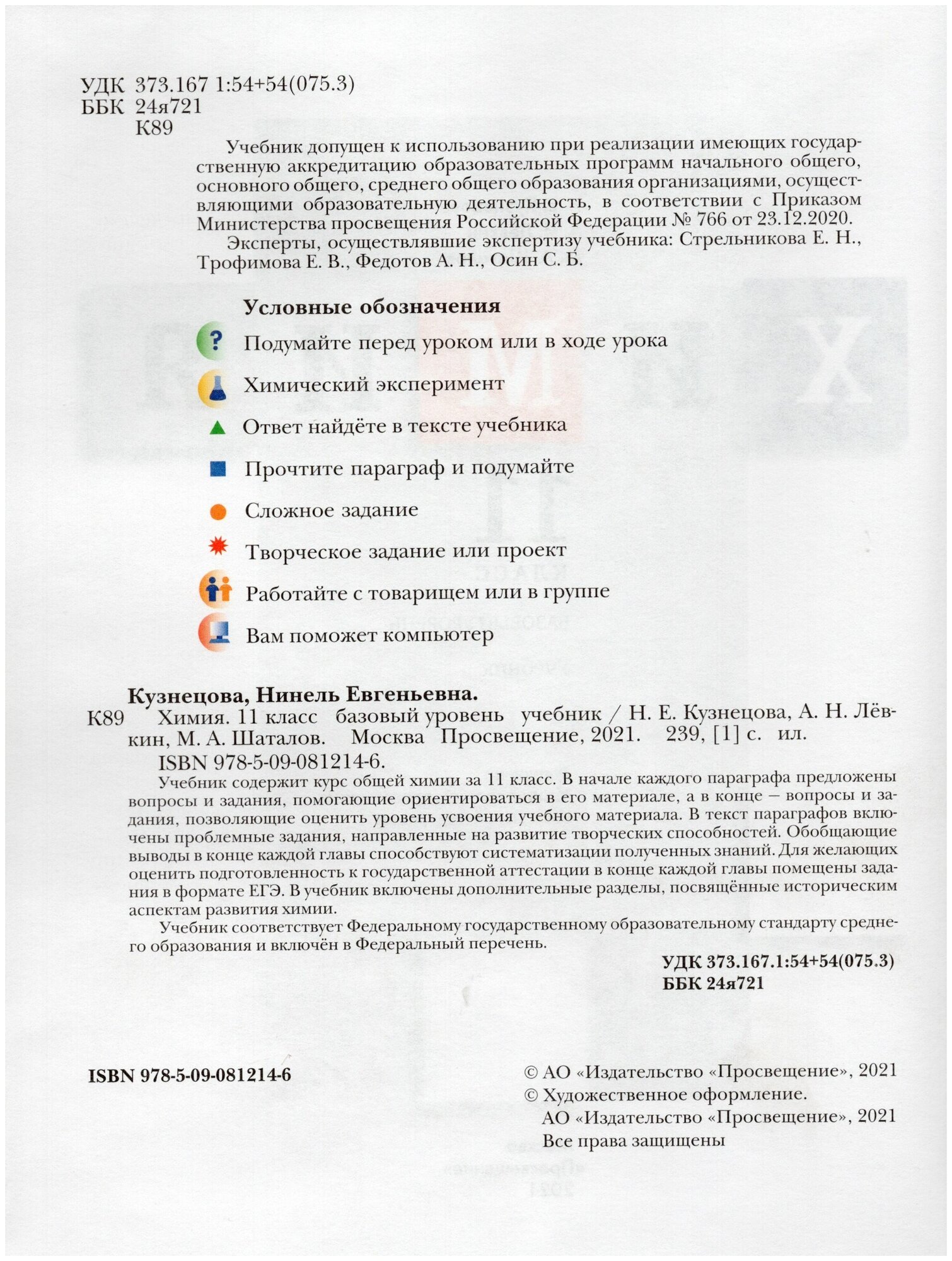 Химия. 11 класс. Базовый уровень. Учебник. (Нинель Евгеньевна Кузнецова, Максим Анатольевич Шаталов, Антон Николаевич Левкин); Просвещение, 2022