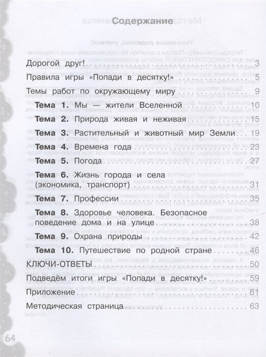 Учебное пособие "Попади в десятку! Окружающий мир. 2 класс" предназначено для систематизации знаний и отработки умений обучающихся 2 класса общеобразовательных организаций по основным разделам курса окружающего мира: "Живая и неживая природа", "Растительный мир Земли", "Времена года", "Погода", "Здоровье человека и его безопасность" и другие.
