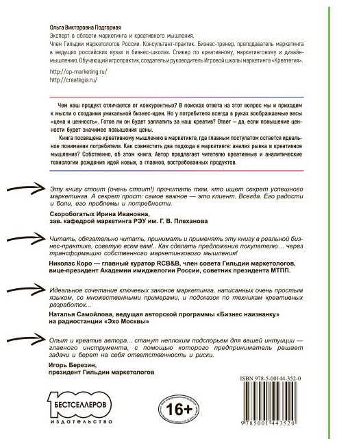Книга посвящена креативному мышлению в маркетинге, где главным постулатом остается идеальное понимание потребителя. Как совместить два подхода в маркетинге: анализ рынка и креативное мышление? Собственно, об этом книга. Автор предлагает читателю креативные и аналитические технологии рождения идей новых, а главное, востребованных продуктов.