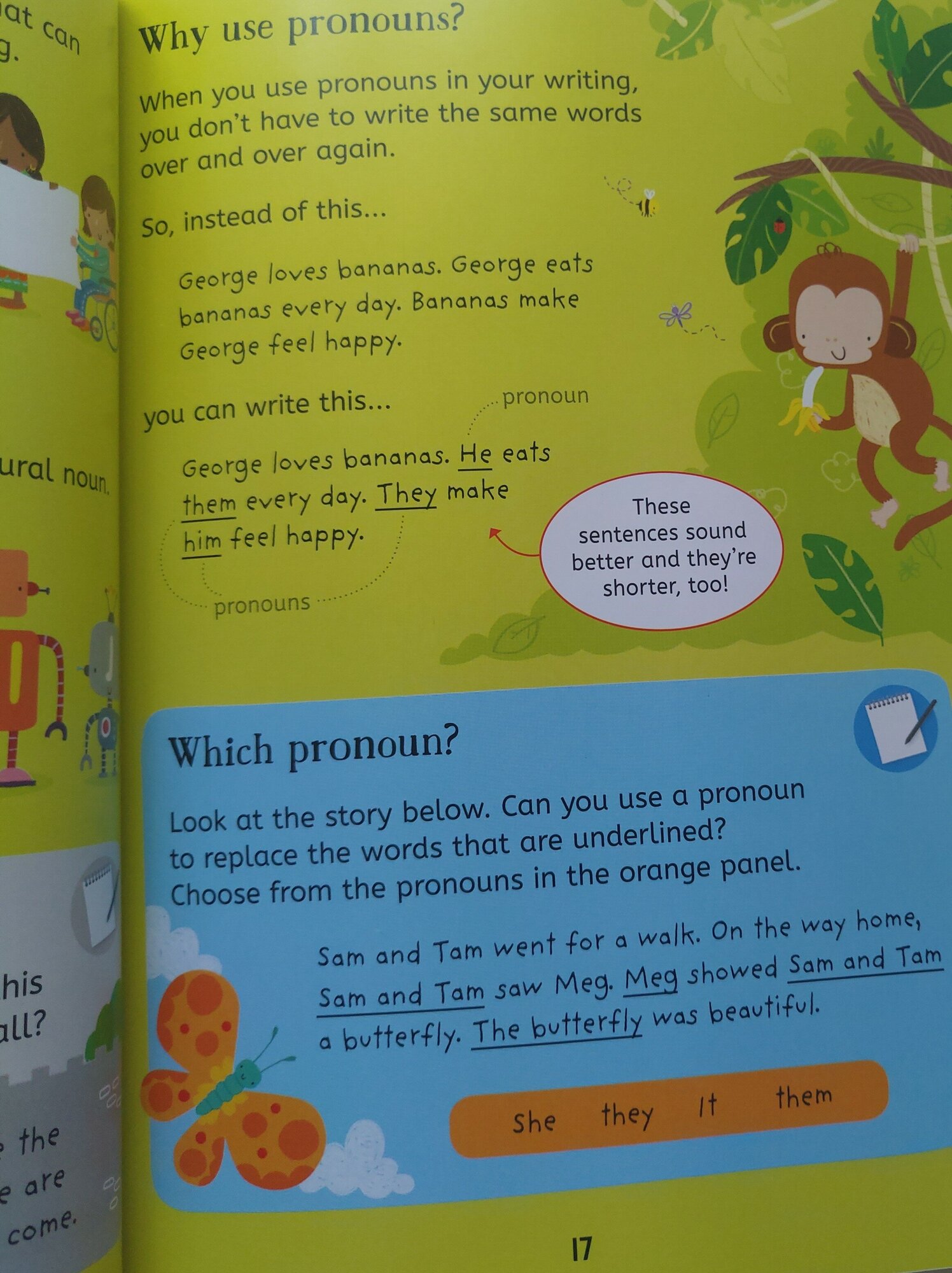 Просто изумительная грамматика для детей от известного издательства Usborne. Ёмко, компактно, понятно и интересно. Грамматика действительно иллюстрированная, то есть как теория, так и примеры объяснены с помощью таблиц, блоков, стрелочек, выделения и подчёркивания важных моментов. Можно смело использовать в качестве справочника. Ну и конечно, грамматика цветная. Ведь современных детей трудно увлечь учебником в чёрно-белом исполнении.
