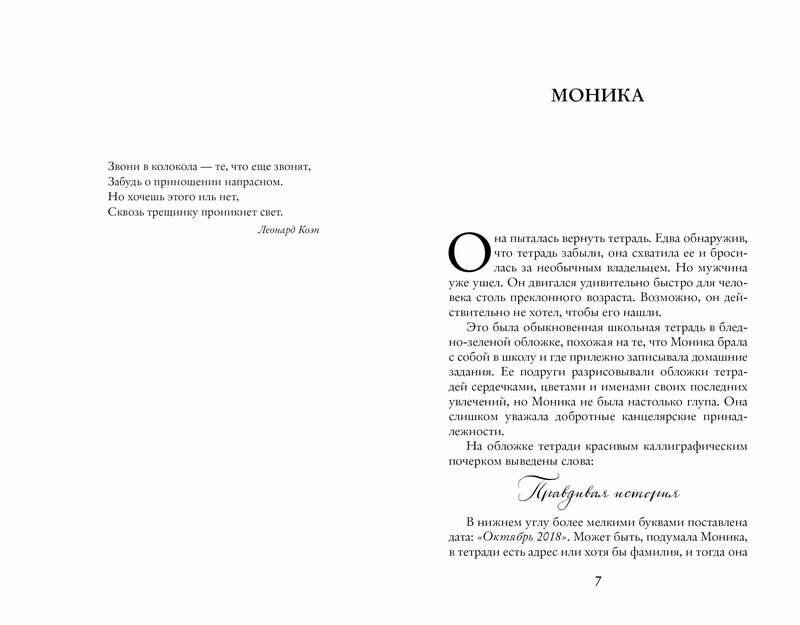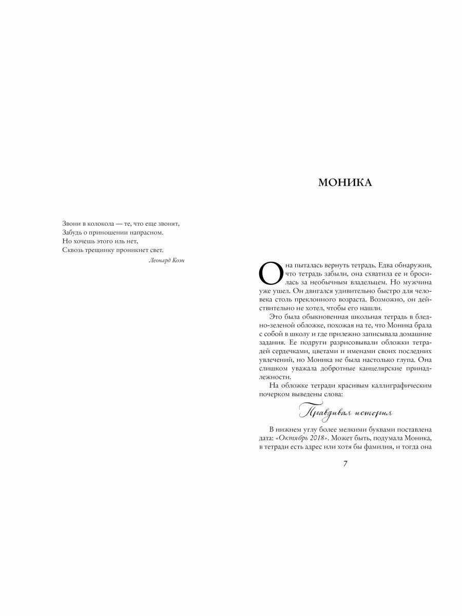 Кто мог знать,что обычная тетрадь изменит в корне жизнь главной героини.Моника простая девушка со множеством целей,особым укладом жизни и определенными принципами.Владеет небольшим кафе,чем вполне довольна.Однажды после ухода всех посетителей Моника находит тетрадь в которой написана история одного художника.В конце истории автор предлагает написать свою историю,чем очень заинтересовал хозяйку кафе.