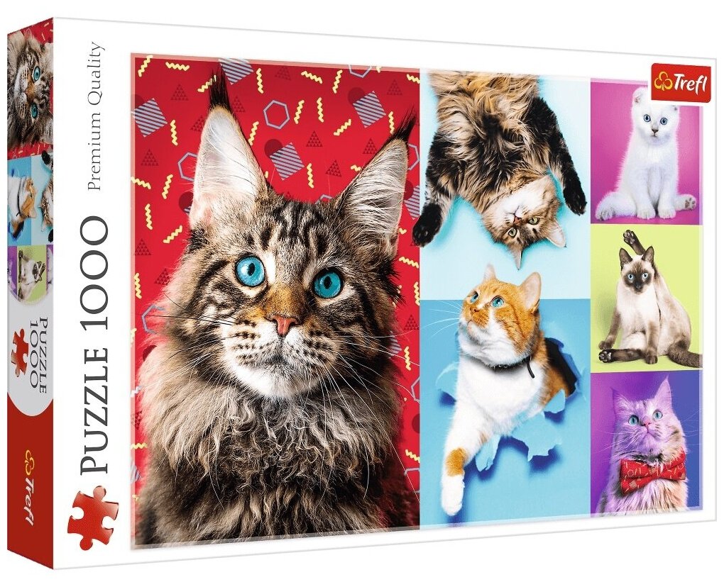 Пазлы Счастливые котики от ТМ Trefl составляются из 1000 фигурных деталей и позволяют собрать яркую, красивую и жизнеутверждающую картину в жанре коллаж с изображениями милых котят и кошек.