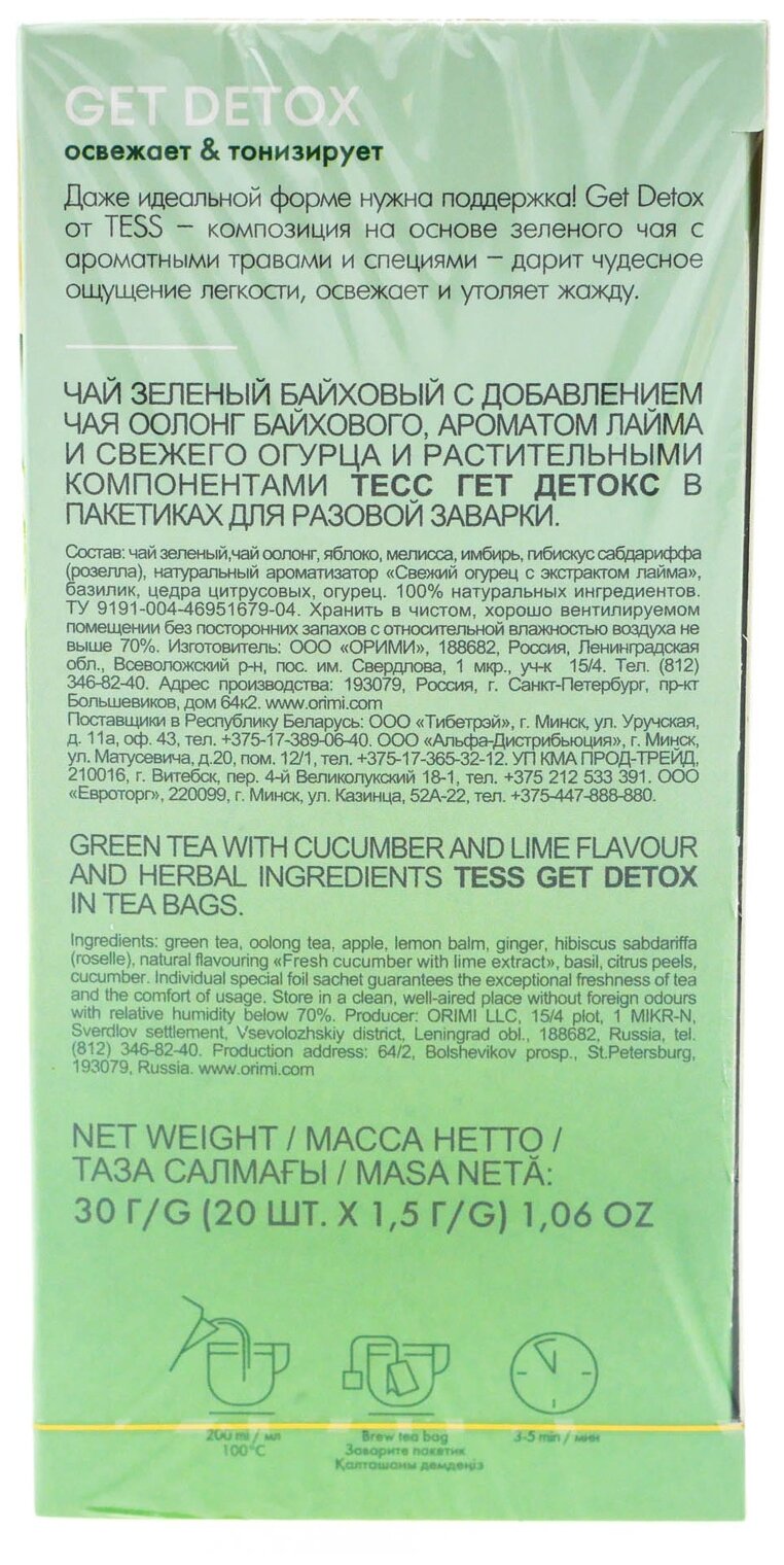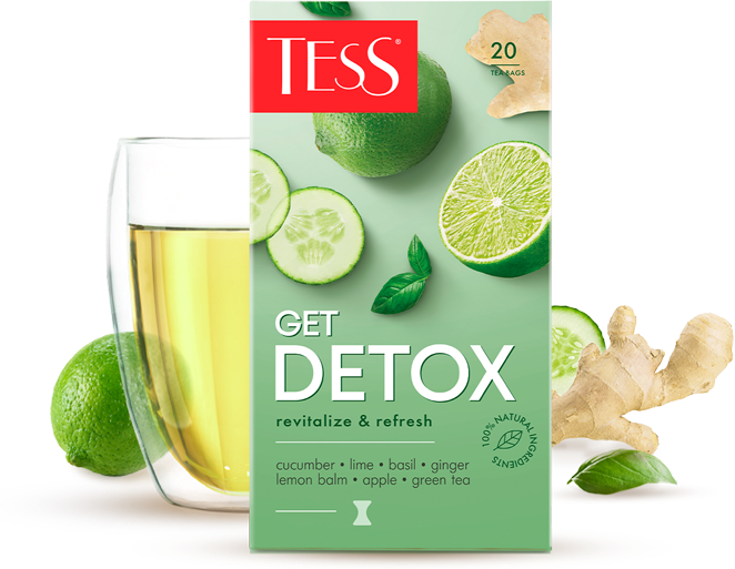 Зеленый чай Tess Гет Детокс в индивидуальных пакетиках - для всех, кто ведет здоровый образ жизни. Купаж из натурального китайского зеленого чая и сорта оолонг дополнен кусочками сублимированных фруктов, овощей, а также - душистыми травами, пряностями и цитрусовой цедрой. Имеет приятный освежающий вкус с сладкими нотками, бодрящий аромат. Обеспечивает детокс-действие на организм, стимулирует обмен веществ, заряжает энергией. Яблоко, базилик, имбирь и огурец - источник витаминов и антиоксидантов. Напиток дарит легкость, вкусный в горячем и холодном виде.