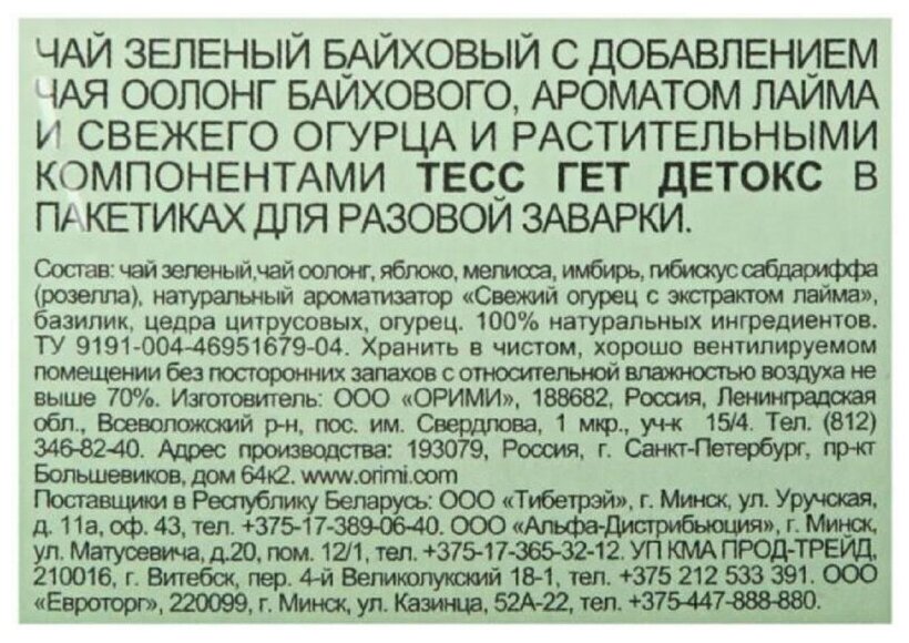 | Состав | Чай зеленый, чай оолонг, яблоко, мелисса, имбирь, гибискус сабдариффа (розелла), натуральный ароматизатор Свежий огурец с экстрактом лайма, базилик, цедра цитрусовых, огурец |