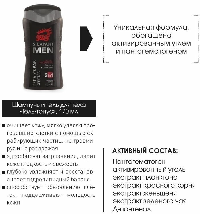 Сегодня все больше мужчин понимают, что здоровая кожа и привлекательный внешний вид имеют огромное значение, и стараются правильно ухаживать за собой. Мужская кожа имеет ряд существенных отличий, поэтому необходимо использовать только те косметические средства, которые могут наиболее полно удовлетворить все ее потребности и решить все проблемы. Мужская кожа более плотная, более жирная и менее чувствительная, нежели женская, и потому она требует особого ухода. Гель-скраб "Бодрость и обновление" силапант специально разработан для ухода за кожей мужчины. Его главное достоинство - это уникальная формула, обогащенная активированным углем, пантогематогеном, экстрактами женьшеня и красного корня. Гель-скраб эффективно очищает кожу, не травмируя и не раздражая, а его яркий аромат подарит вам заряд бодрости и отличного настроения на весь день.Гель-скраб "Бодрость и обновление" оказывает следующее действие:очищает кожу, мягко удаляя ороговевшие клетки с помощью скрабирующих частицадсорбирует загрязнениядарит коже гладкость и свежестьповышает упругость и эластичностьглубоко увлажняет и восстанавливает гидролипидный балансспособствует обновлению клетокподдерживает молодость кожи Активные компоненты геля оказывают очищающее, увлажняющее и омолаживающее действие. Один из основных компонентов - активированный уголь. Он обладает мощными адсорбирующими свойствами, способствует снижению жирности кожи, глубоко очищает поры. Пантогематоген содержит аминокислоты, осуществляющие функцию интенсивного питания и регенерации клеточных систем кожи. Пантогематоген стимулирует кровообращение, процессы образования новых клеток, предотвращает появление ранних морщин и замедляет процессы старения кожи. Экстракт планктона борется с несовершенствами кожи, оптимизирует обновление клеток, стимулирует естественные защитные механизмы кожи и внутреннюю способность кожи к самоувлажнению. Экстракты красного корня, женьшеня и зеленого чая очищают и тонизируют кожу, способствуют заживлению поврежденной кожи, смягчают и увлажняют ее. Натуральные экстракты обладают тонизирующими свойствами, способствуют восстановлению кислотно-щелочного баланса кожных покровов, стимулируют обменные процессы в коже. Для наиболее эффективного ухода за мужской кожей рекомендуем вам ознакомиться с другими натуральными средствами, способствующими сохранению здоровья и красоты.