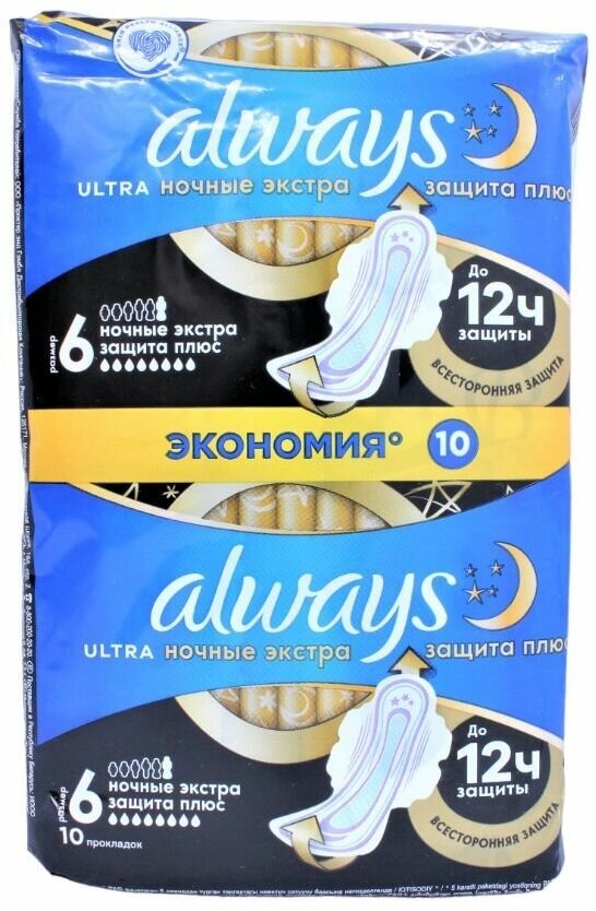 | Полное наименование | Прокладки Always Ultra Night гигиенические экстра защита плюс 10 шт |