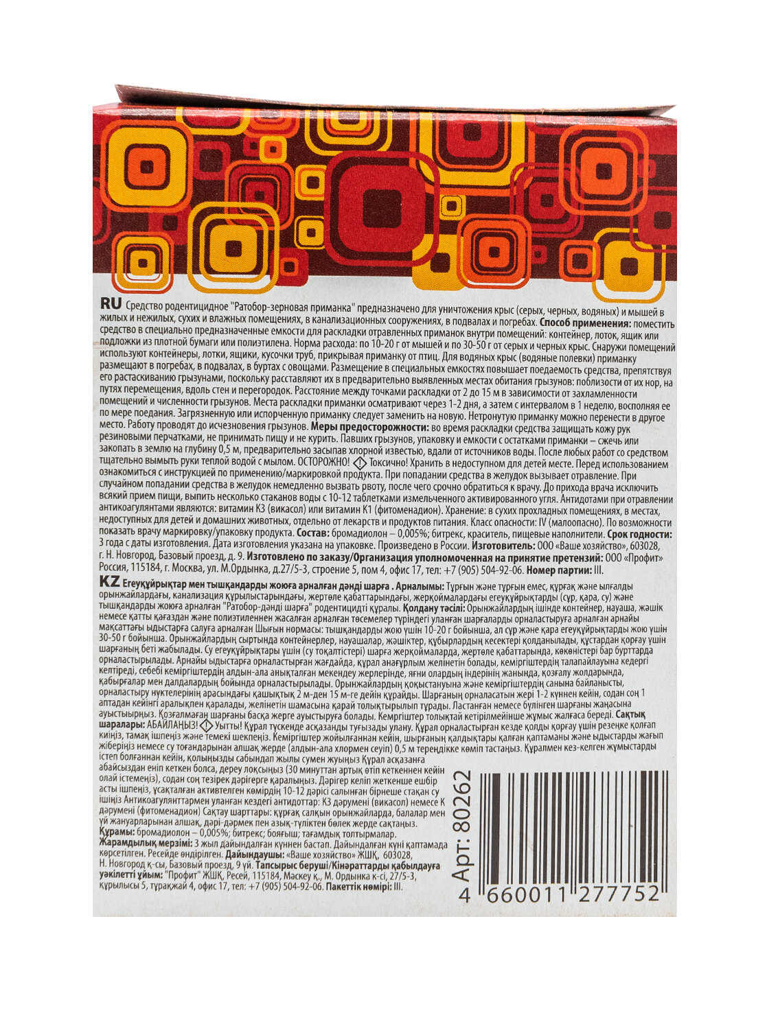Тип товара: Зерновая приманка для уничтожения крыс и мышей