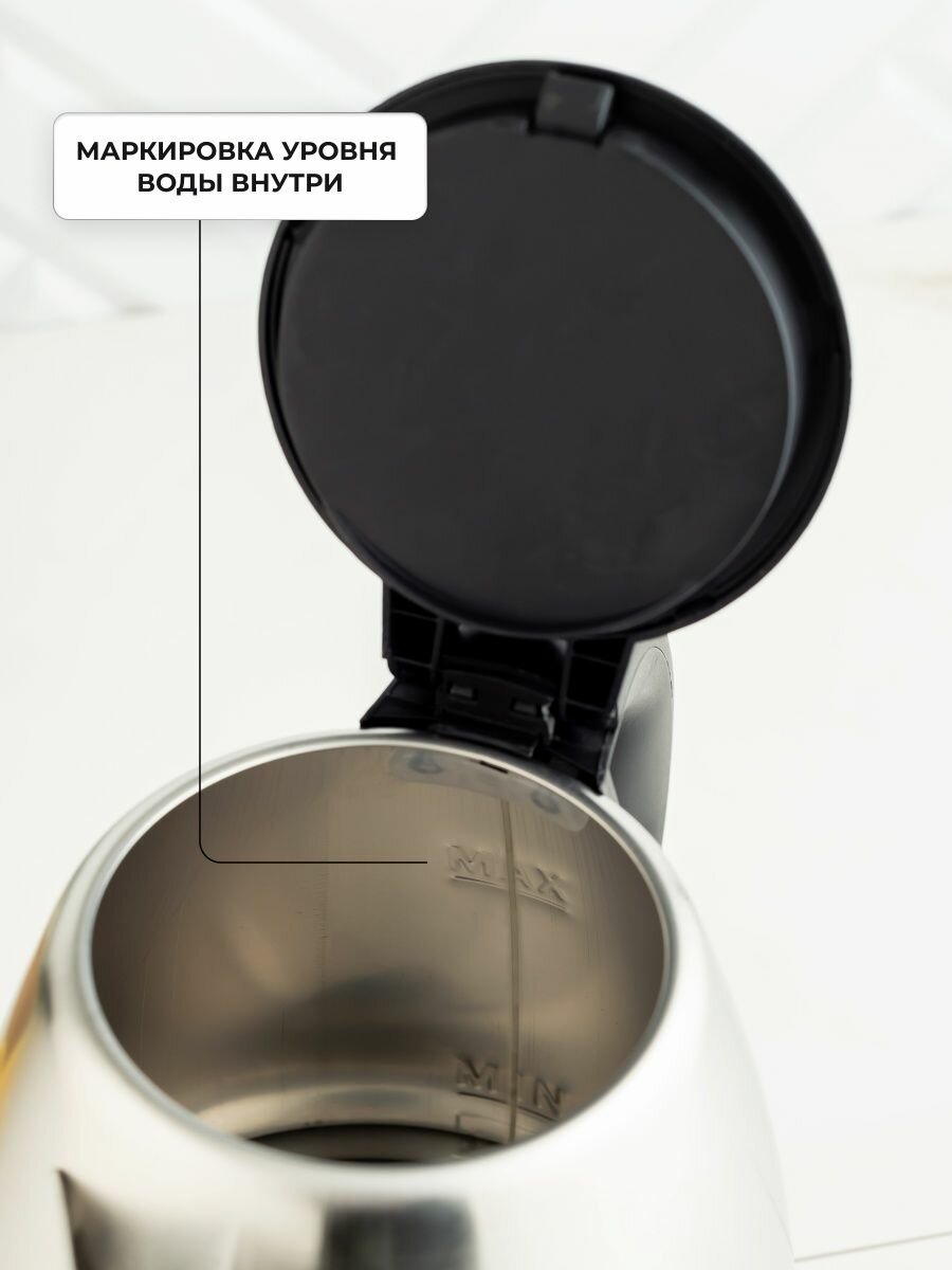 Чайник электрический предназначен для нагрева воды в бытовых и аналогичных условиях, в частности: в кухонных зонах для персонала в магазинах, офисах и прочих производственных условиях, в фермерских домах, клиентами в гостиницах, мотелях и прочей инфраструктуре жилого типа, в условиях режима пансиона «проживание плюс завтрак». Корпус из высококачественной нержавеющей стали. Матовая полировка. Вращение корпуса на 360°. Цвет базы, крышки и ручки: черный. Закрытый нагревательный элемент из нержавеющей стали. Отметка максимального уровня воды внутри корпуса. Световой индикатор работы. Отсек для хранения электрошнура. Автоматическое отключение при закипании. Блокировка включения без воды.