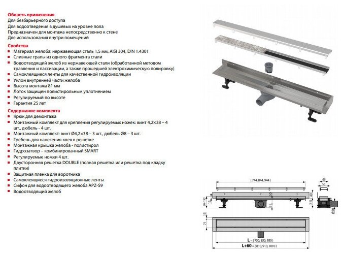 | ВКоробке | Душевой желоб - 1 шт. Прокладка гидроизолирующая - 1 шт. Инструкция - 1 шт. |