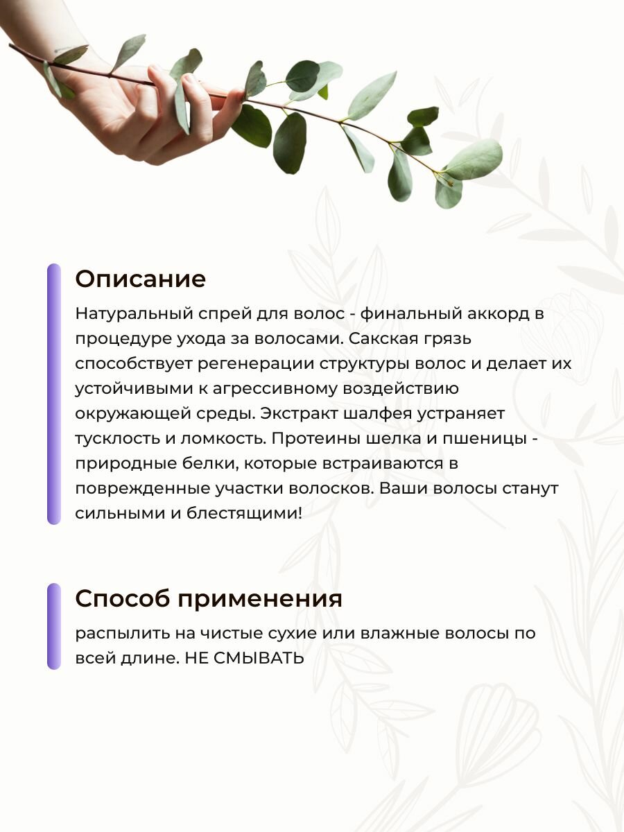 Натуральный спрей для волос - финальный аккорд в процедуре ухода за волосами. Сакская грязь способствует регенерации структуры волос и делает их устойчивыми к агрессивному воздействию окружающей среды. Экстракт шалфея устраняет тусклость и ломкость. Протеины шелка и пшеницы - природные белки, которые встраиваются в поврежденные участки волосков. Ваши волосы станут сильными и блестящими!