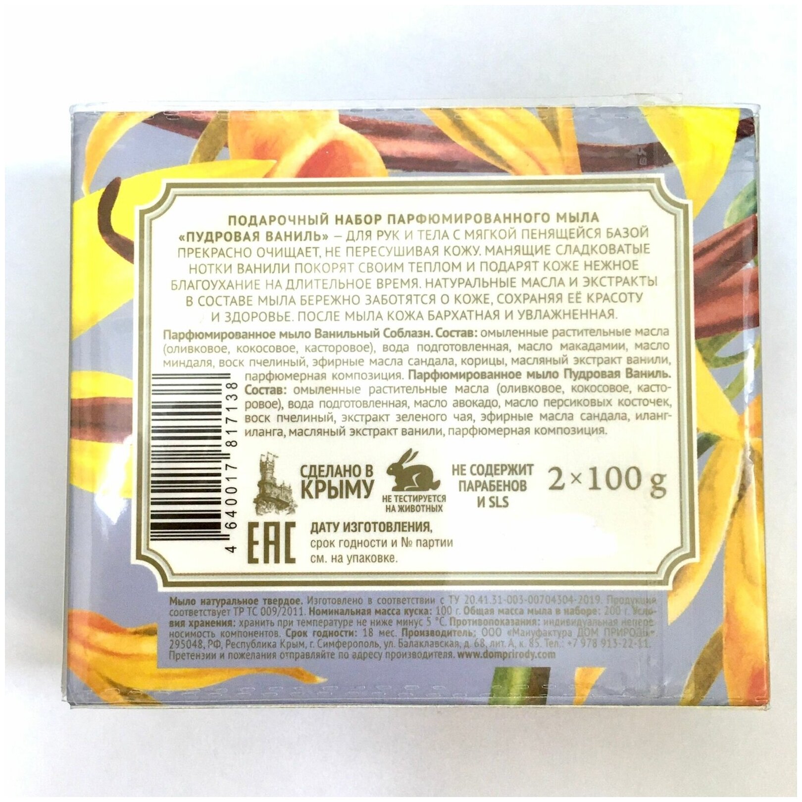 Манящие сладковатые нотки ванили покорят своим теплом и подарят коже нежное благоухание на длительное время. Натуральные масла и экстракты в составе мыла бережно заботятся о коже, сохраняя ее красоту и здоровье. После мыла кожа бархатная и увлажненная.