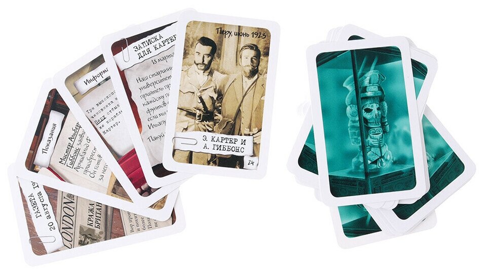 Объединить усилия. Информация поступает к следственной группе из разрозненных источников, так что в процессе команде сложно ею обмениваться. Игроки настольной игры Смерть археолога могут свободно делиться своими версиями и предположениями, но факты – дело другое. Они изложены на картах, которые поначалу находятся у игроков на руках (по 2 или по 3 штуки, в зависимости от количества участников игры), и становятся общим достоянием, если игрок примет решение приобщить данные материалы к делу. Тогда карта выкладывается на стол лицевой стороной вверх, и любой детектив может перечитать изложенную на ней информацию, но если в конце выяснится, что след был ложным, тот, кто объявил эту улику важной, потеряет очко.