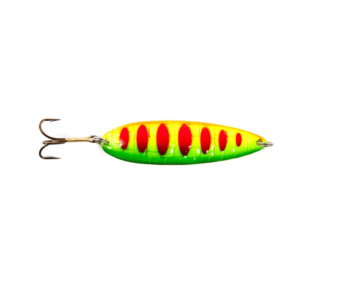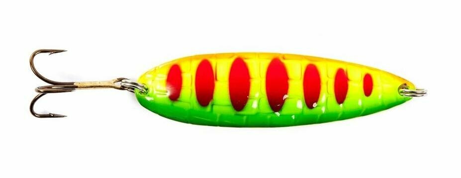 Croco Spoon - узкотелая колеблющая блесна, с изогнутым профилем хвостовой части. Блесна прекрасно летит при забросе и размашисто играет при проводке. Внешняя сторона приманки, выполненная в виде рельефной поверхности с нанесенным на нее рисунком, хорошо привлекает хищную рыбу с большого расстояния.
