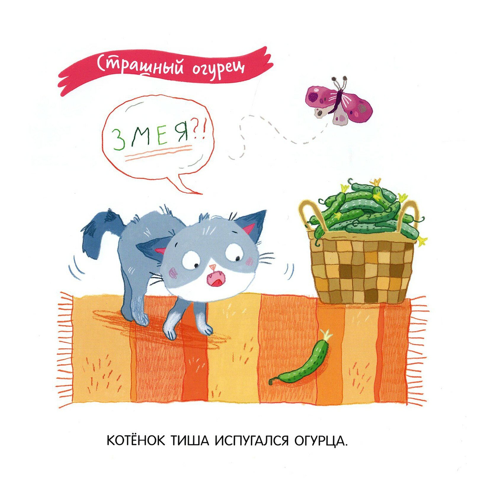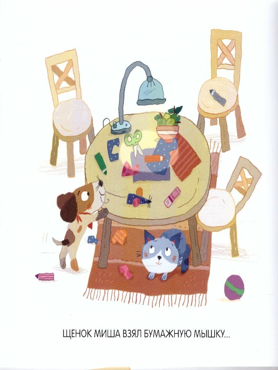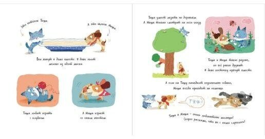 - Весёлые истории про котёнка Тишу и щенка Мишу вызывают яркие эмоции у малышей: удивление, смех, радость, интерес. Так и хочется обсудить со взрослым каждую картинку, а потом рассказать о приключениях забавных героев самостоятельно.