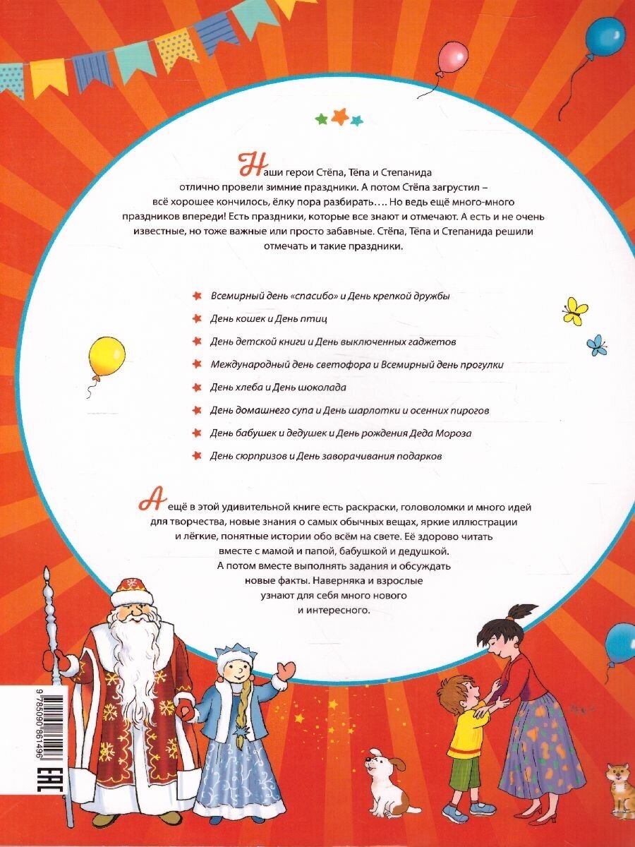 Наши герои Стёпа, Тёпа и Степанида отлично провели зимние праздники. А потом Стёпа загрустил - всё хорошее кончилось, ёлку пора разбирать…. Но ведь ещё много-много праздников впереди! Есть праздники, которые все знают и отмечают. А есть и не очень известные, но тоже важные или просто забавные. Например, вот такие: