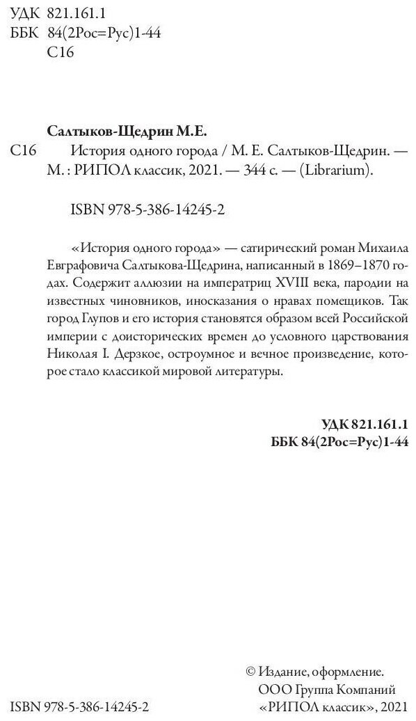 Книга: История одного города (Салтыков-Щедрин Михаил Евграфович); Рипол Классик, 2021