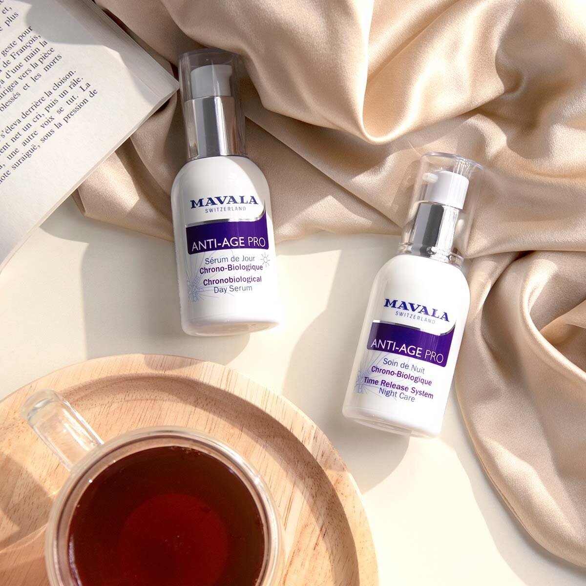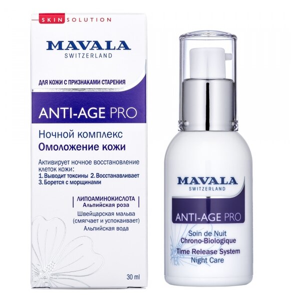 Агрессивное воздействие внешней среды приводит к преждевременному старению кожи. За ночь клетки не успевают восстанавливаться, лицо выглядит «усталым» и тусклым, появляются морщины. Ночной комплекс «Омоложение кожи» Anti-Age Pro— это последняя разработка исследовательской лаборатории швейцарской компании Mavala. Специалисты создали средство, способное вернуть коже молодость и сияние, разгладить морщины и осветлить пигментные пятна. Компоненты комплекса синхронизируются с естественным биоритмом клеток кожи во время сна. Во время первой фазы сна экстракт швейцарского Кресса выводит токсины. Во время второй фазы стволовые клетки Альпийской Розы запускают процесс регенерации клеток. На третьей фазе, липоаминокислота восстанавливает коллагеновые волокна кожи, а anti-dark spot комплекс из Арбутина, витаминов С и Е, выравнивает цвет лица и уменьшает видимость пигментных пятен. Эффективность инновационного комплекса «Омоложение кожи» Anti-Age Pro подтверждена независимым тестированием среди женщин, которое показало, что результат заметен на первое утро после использования.