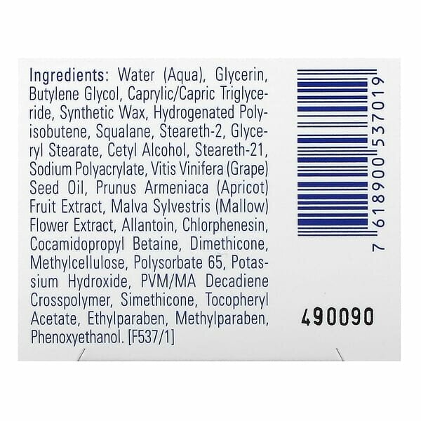| Состав | water (aqua), glycerin, butylene glycol, caprylic/capric triglyceride, synthetic wax, hydrogenated polyisobutene, squalane, steareth-2, glyceryl stearate, cetyl alcohol, steareth-21, sodium polyacrylate, vitis vinifera (grape) seed oil, prunus armeniaca (apricot) fruit extract, malva sylvestris (mallow) flower extract, allantoin, chlorphenesin, cocamidopropyl betaine, dimethicone, methylcellulose, polysorbate 65, potassium hydroxide, pvm/ma decadiene crosspolymer, simethicone, tocopheryl acetate, ethylparaben, methylparaben, phenoxyethanol. [f537/1]. |
