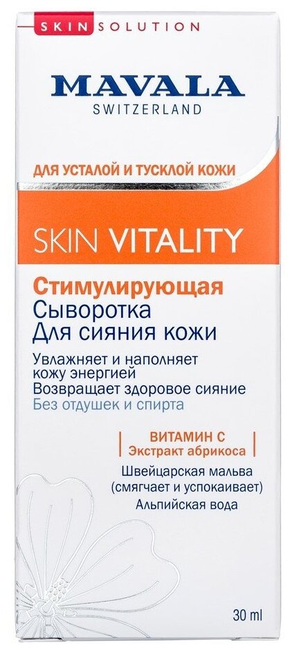 Недостаток сна, стресс, загрязнения окружающей среды, УФ-излучение, сигаретный дым – все это замедляет метаболизм кожи. Поры расширяются. Кожа теряет сияние, становится тусклой и приобретает нездоровый оттенок. Это называют «усталым» цветом лица. В результате кожа выглядит старше. Линия ухода за кожей Swiss Skin Solution от швейцарской марки Mavala создана на основе слияния швейцарской природы и научной косметологии. Уникальные формулы, разработанные в лаборатории Mavala в Женеве, обеспечивают стойкий и видимый результат. Одним из основных компонентов Стимулирующей сыворотки для сияния лица является экстракт швейцарского Абрикоса, содержащий богатый питательный коктейль. Витамин С увлажняет кожу, поливитамин А обладает тонизирующим и антиоксидантным свойствами, а энзимы мягко отшелушивают кожу. Пудра из белых жемчужин теплого оттенка придает коже свежесть и естественное сияние. Без отдушек, спирта и парабенов. Стимулирующая Сыворотка увлажняет, защищает и возвращает сияние усталой и тусклой коже лица. Эффективность подтверждена независимым клиническим тестированием: 90% респондентов отметили, что цвет лица стал более свежим; 95% подтвердили, что кожа стала выглядеть отдохнувшей. Сыворотка имеет деликатную, ультра легкую текстуру. Наибольший эффект достигается в сочетании со Стимулирующим Дневным Кремом SKIN VITALITY. Идеально подходит для зоны декольте.