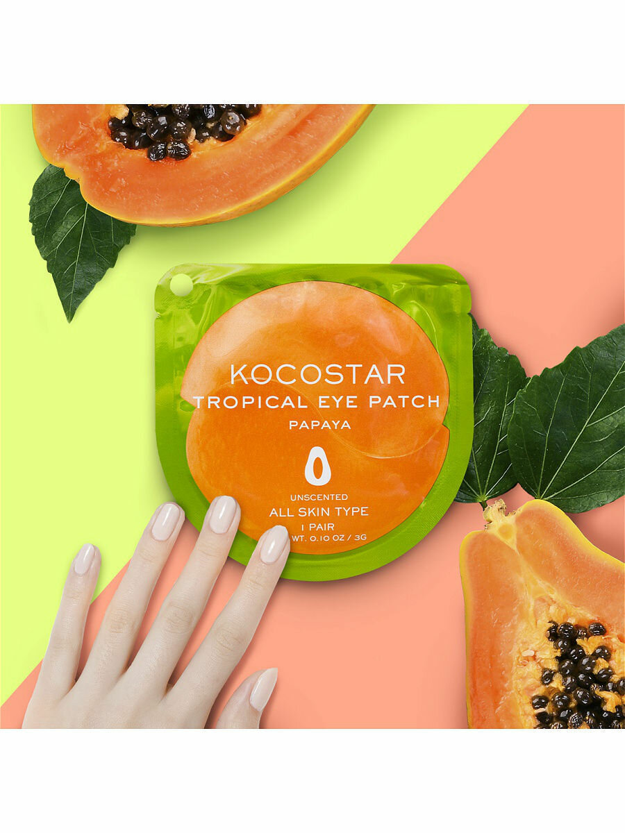 Патчи для глаз Kocostar Tropical Eye Patch Papaya содержат экстракт плодов папайи, которая считается эликсиром молодости и красоты. Папайа заметно смягчает кожу, питая ее и способствуя регенерации, повышает защитные свойства кожного барьера. Кофеин в составе тонизирует и борется с отеками. Аллантоин и алоэ вера смягчают нежную кожу под глазами, снимая раздражение.