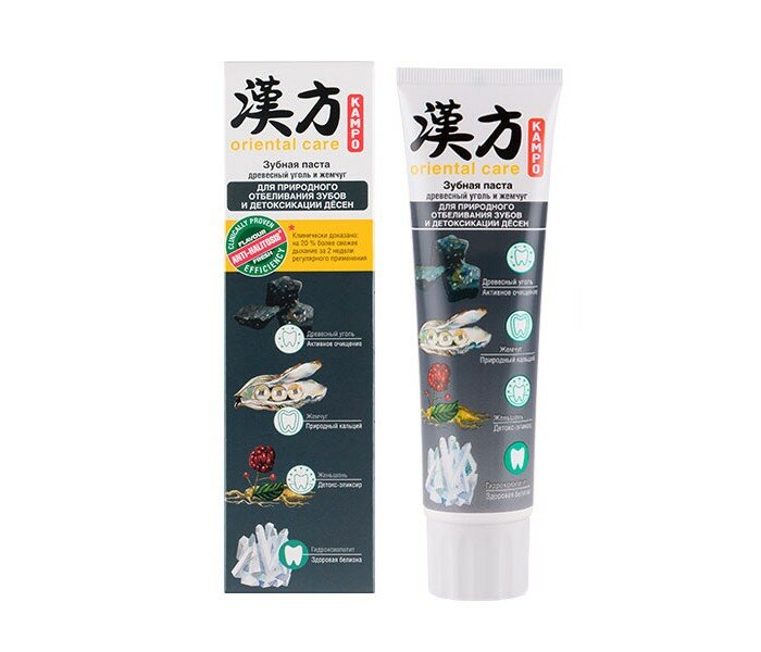Kampo Oriental Care Паста зубная Древесный уголь и жемчуг для природного отбеливания зубов и детоксикации дёсен 100 г Уникальная система применения трав, вобравшая в себя многовековую мудрость и культуру японского народа. Серия зубных паст Kampo Oriental Care создана в соответствии с этой древней философией и соблюдением традиций Востока: экстракты японских растений тщательно подобраны и смешаны в оптимальном количестве для обеспечения комплексного и эффективного ухода за полостью рта. Древесный уголь - эффективный сорбент, поглощает красящие и разрушающие эмаль вещества. Экстракт жемчуга оказывает реминерализующее действие и является природным источником биокальция. Экстракт женьшеня обладает тонизирующими свойствами и защищает от токсинов. Гидроксиапатит укрепляет зубную эмаль, придавая ей здоровую белизну. Cостав: Aqua, Hydrated Silica, Sorbitol, Cellulose Gum, Sodium Coco-Sulfate, Charcoal Powder, Hydroxyapatite, Pearl Powder, Flavour Fresh, Tetrasodium Pyrophosphate, Sodium Citrate, Sodium Lactate, Panax Ginseng Root Extract, Sodium Saccharin, Menthol, 2-Bromo-2-Nitropropane-1,3-diol.