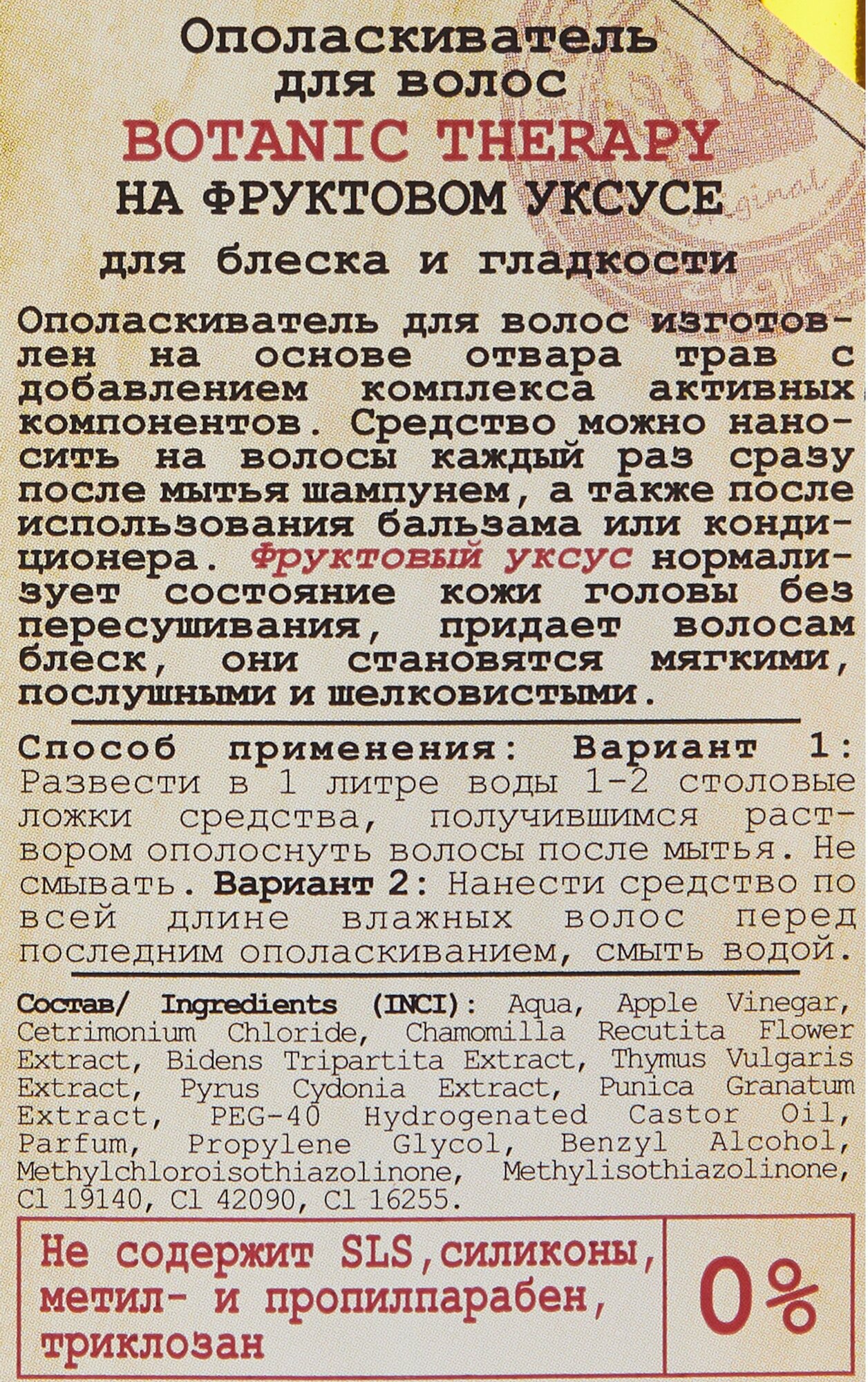 Сервис сравнения цен СкидкаГИД предлагает сравнить цены на товар «Ополаскиватель для волос на фруктовом уксусе для блеска и гладкости Botanic therapy 280 мл Модум-наша косметика СОАО (578696)»