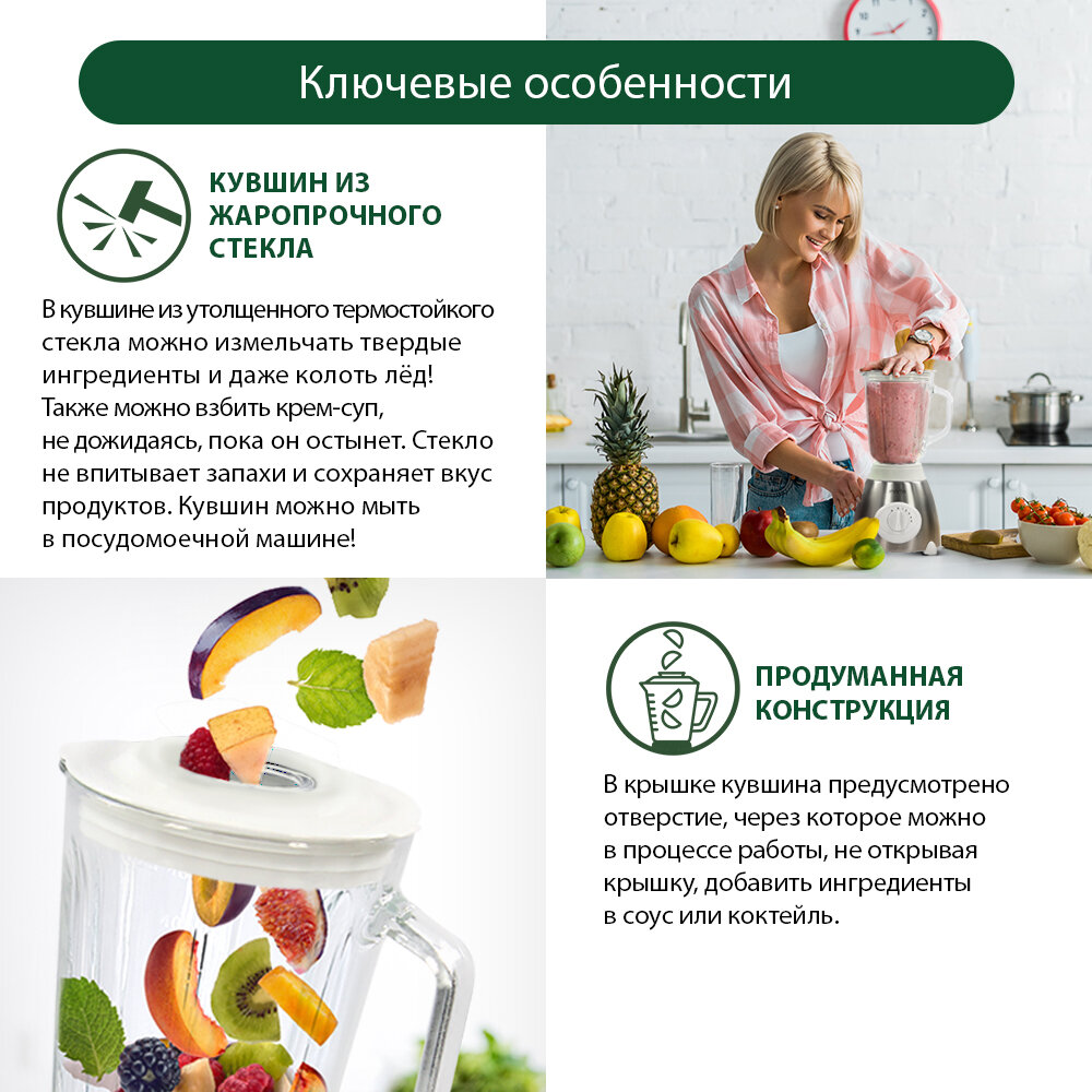 Этот стационарный блендер предназначен для измельчения, взбивания и смешивания различных продуктов до однородной массы. С его помощью можно приготовить полезные смузи и коктейли, а также ароматные супы-пюре и соусы. Мощный двигатель обеспечивает надежность и высокую скорость измельчения. Для оптимальной работы предусмотрены 5 скоростей вращения ножей и импульсный режим. Стеклянная чаша объемом 1,5 л не впитывает запахи и сохраняет оригинальный цвет, вкус и полезные свойства продуктов. Нож из нержавеющей стали не деформируется, не ржавеет, не подвержен коррозии и имеет максимально длительный срок службы. Съемный блок ножа легко извлекается для очистки. Благодаря использованию этого блендера, вы сможете включить в свой рацион больше свежих и полезных блюд. Мощность 1200 Вт - (максимальная мощность мотора при блокировке двигателя).
