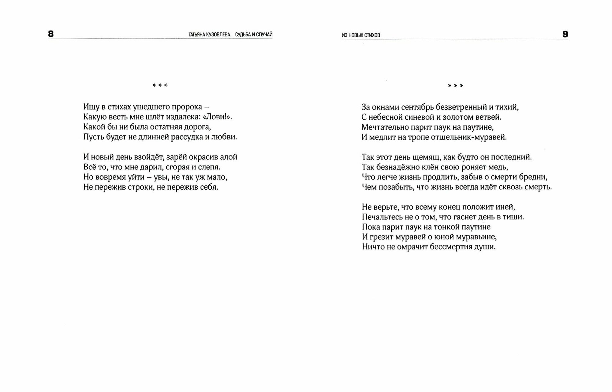 Книга «Судьба и случай» члена Русского ПЕН-центра, поэта, лауреата премии Союза писателей Москвы «Венец», премии имени Анны Ахматовой журнала «Юность», обладателя других литературных наград Татьяны Кузовлевой включает стихотворения как последних лет (один из разделов так и называется – «Из новых стихов»), так и написанное в 1960-е – нулевые годы. Кузовлевская лирика – скрещение судьбы и памяти, любви и смерти, истины и тайны…