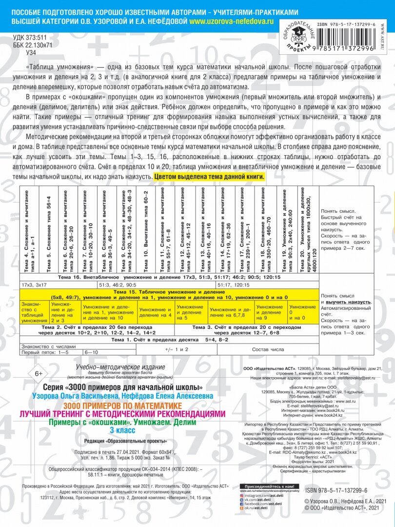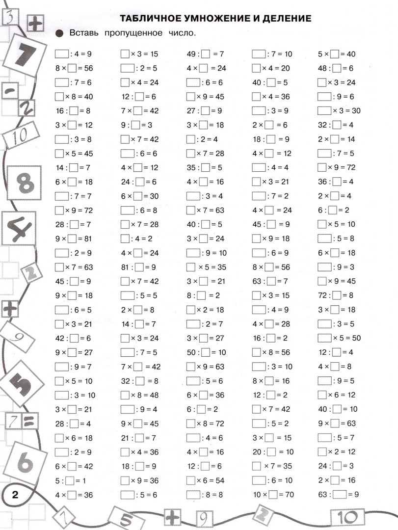 «Таблица умножения» - одна из базовых тем курса математики начальной школы. После пошаговой отработки умножения и деления на 2, на 3 и т.д. (в аналогичной книге для 2 класса) предлагаем примеры на табличное умножение и деление вперемешку, которые позволят отработать навык счёта до автоматизма. В примерах с «окошками» пропущен один из компонентов умножения (первый множитель, второй множитель, произведение) или знак действия. Ребёнок должен определить, что пропущено в примере и как это можно найти. Такие примеры – отличный тренинг для формирования навыка выполнения устных вычислений, а также для развития умения устанавливать причинно-следственные связи при выборе способа решения.