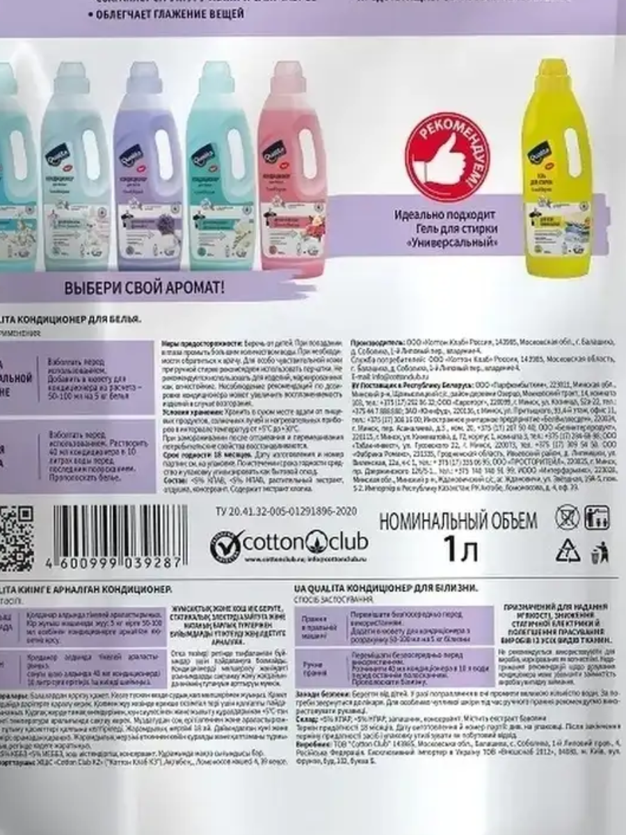 | Способ применения | Взболтать перед применением. Добавить в кювету для кондиционера из расчета 50-100 мл на 5 кг белья |