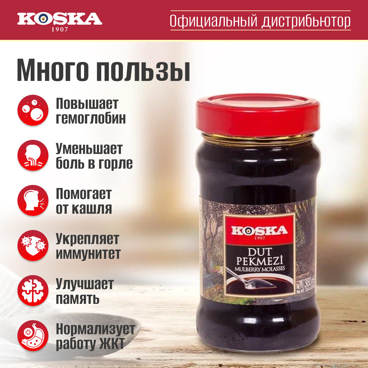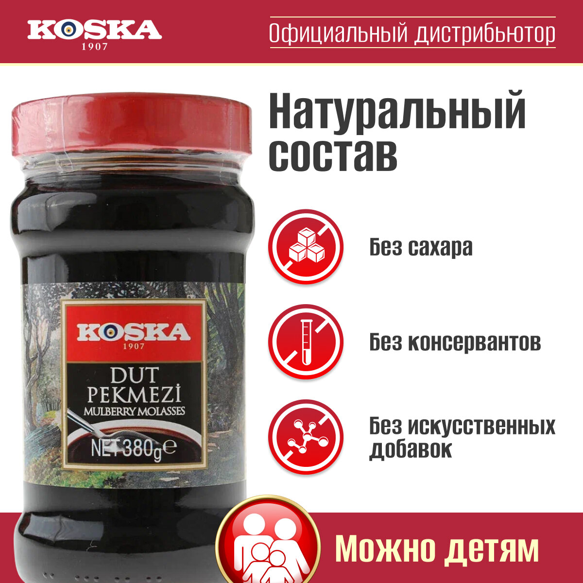 Пекмез из шелковицы, Koska, 380 г. Натуральный сироп из плодов шелковицы без сахара.Пекмез из шелковицы - это уникальный по своему вкусу и составу продукт. Он представляет собой загущенный сироп из плодов тутового дерева, который готовится по особой технологии и при низких температурах, благодаря чему все полезные свойства остаются в готовом пекмезе. При приготовлении пекмеза не используются консерванты, искусственные добавки и сахар, поэтому им могут наслаждаться как взрослые, так и дети. Пекмез из шелковицы является отличным источником энергии для физической и умственной активности, способствует укреплению иммунитета и уменьшает боль в горле.Также этот продукт может использоваться в качестве природного заменителя сахара приверженцами здорового образа жизни.
