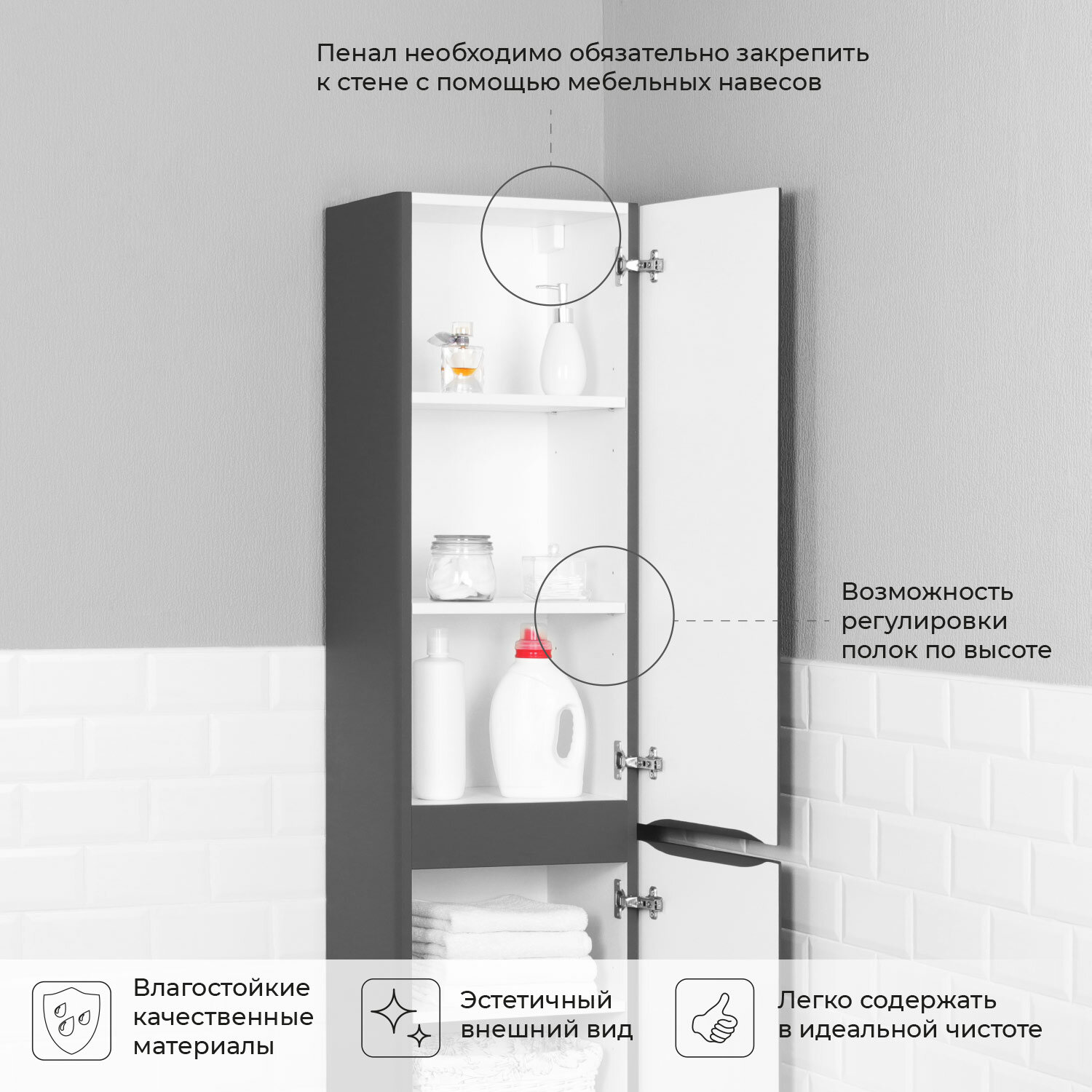 Пенал подвесной Мишель 40 - поможет организовать в ванной комнате удобное пространство для хранения косметических принадлежностей, белья, полотенец, средств для уборки. Изделие достаточно вместительное за счет высоты и в то же время не занимает много места. Габаритные размеры: 400х350х1550 Корпус и фасады изготовлены из МДФ , покрыты эмалью. При изготовлении пенала использованы прочные, долговечные материалы, стойкие к воздействию влаги.