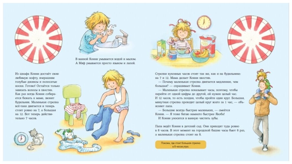 Бабушка подарила Конни будильник, и теперь её любимое занятие — определять время. Интересно, почему большая стрелка двигается быстрее, чем маленькая? А четверть часа — это сколько? И что можно успеть сделать за секунду?• Серия “Лучший друг — Конни” — бестселлер! Продано более 300 000 книг на русском языке.• Новый большой формат — книга-картонка с окошками и плотными страницами.• Научит определять время по разным часам.Внутри книги вы найдёте:● часы с настоящими стрелочками;● подсказки, как определять время;● гид по разным видам часов.Цитата— Почему время иногда долго тянется, а иногда пролетает очень быстро? — удивляется Конни.ОсобенностиОбо всём расскажем, а главное, покажем! Новые книги-картонки с окошками от Конни познакомят малыша с окружающим миром в игровой форме.● Картинки-окошки● Советы и правила● Научные факты и истории из жизниО серииВот уже 20 лет малыши во всем мире растут вместе с Конни — доброй девочкой в забавной полосатой футболке. С этими книгами ребенок перестанет бояться врача, первого дня в садике или школе, поймет, что животные в доме — это большая ответственность.Серия охватывают все жизненные навыки, с которыми ребенок встречается во время взросления от 3 до 15 лет. Ассоциируя себя с главной героиней, малыш проживает ее историю, учится и познает мир.Для когоДля детей от 4 лет, мальчиков и девочек
