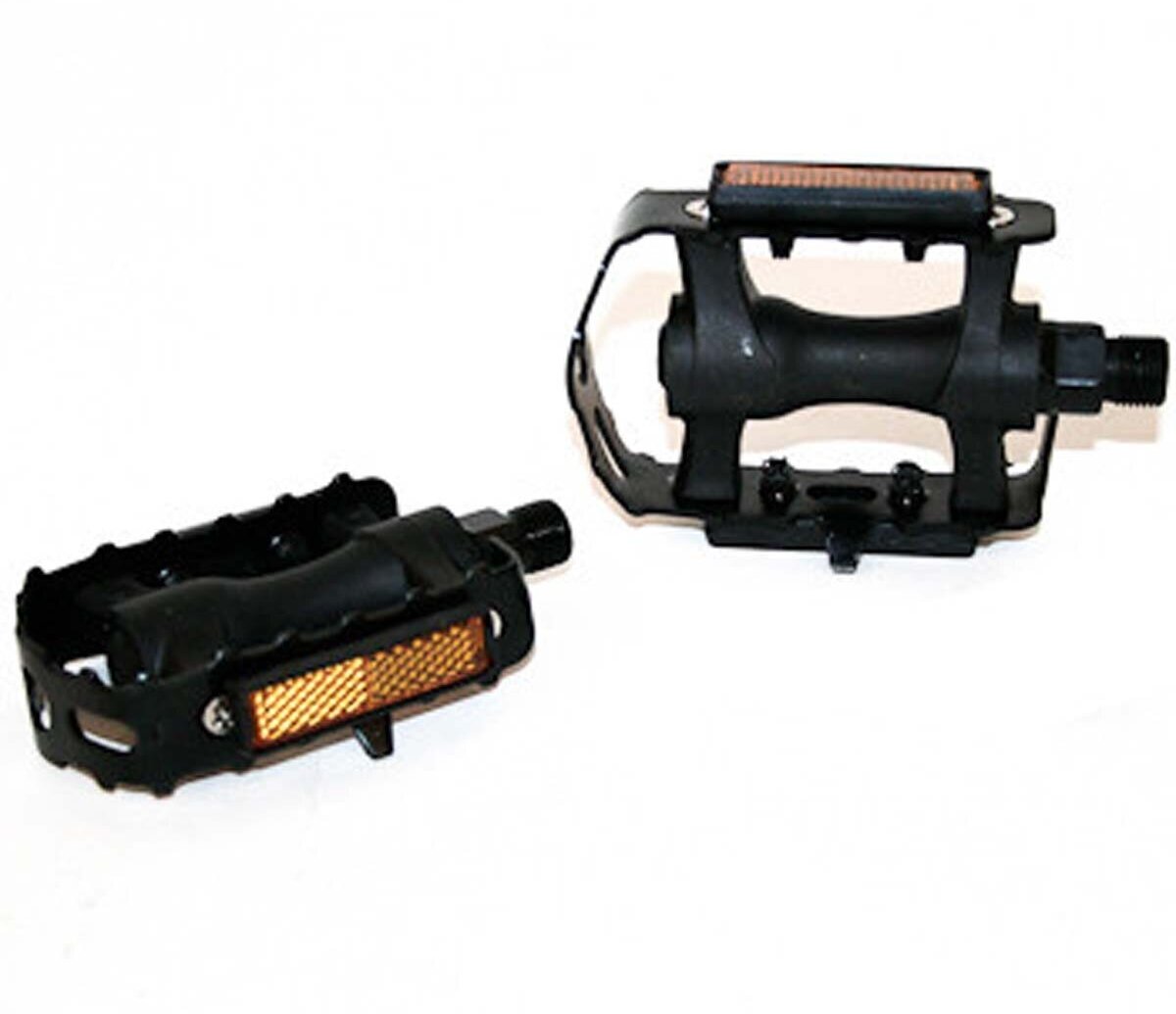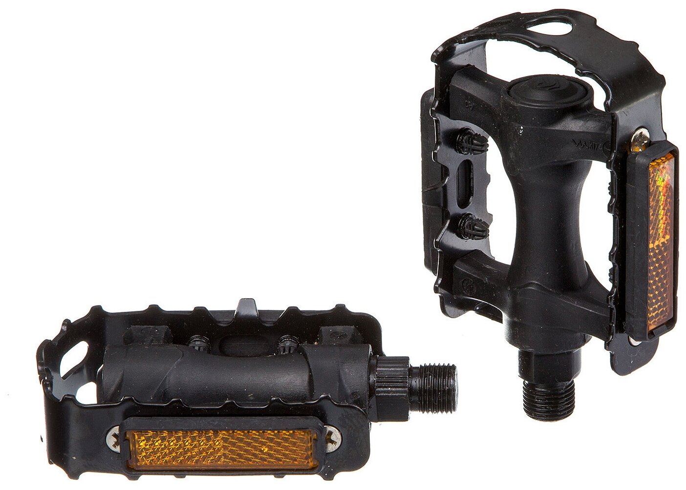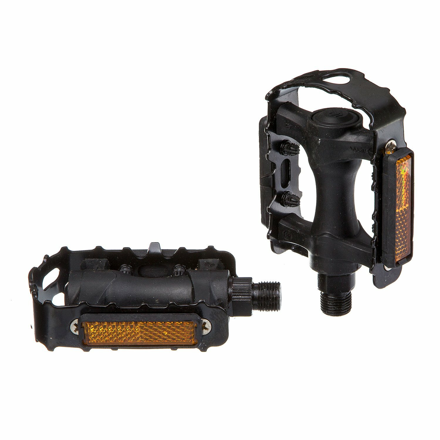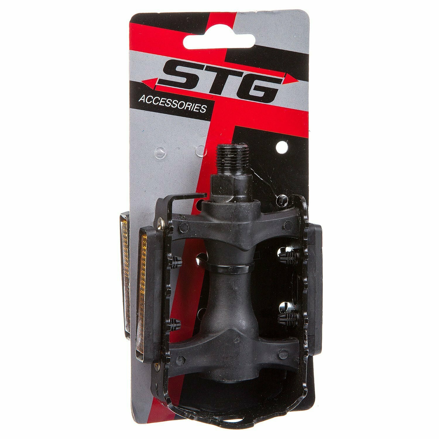 Педали STG, материал корпуса высокопрочный пластик, имеет прорезиненные вставки для повышенного сцепления с обувью. Подшипник шариковый, световозвращатели в торцах педалей.