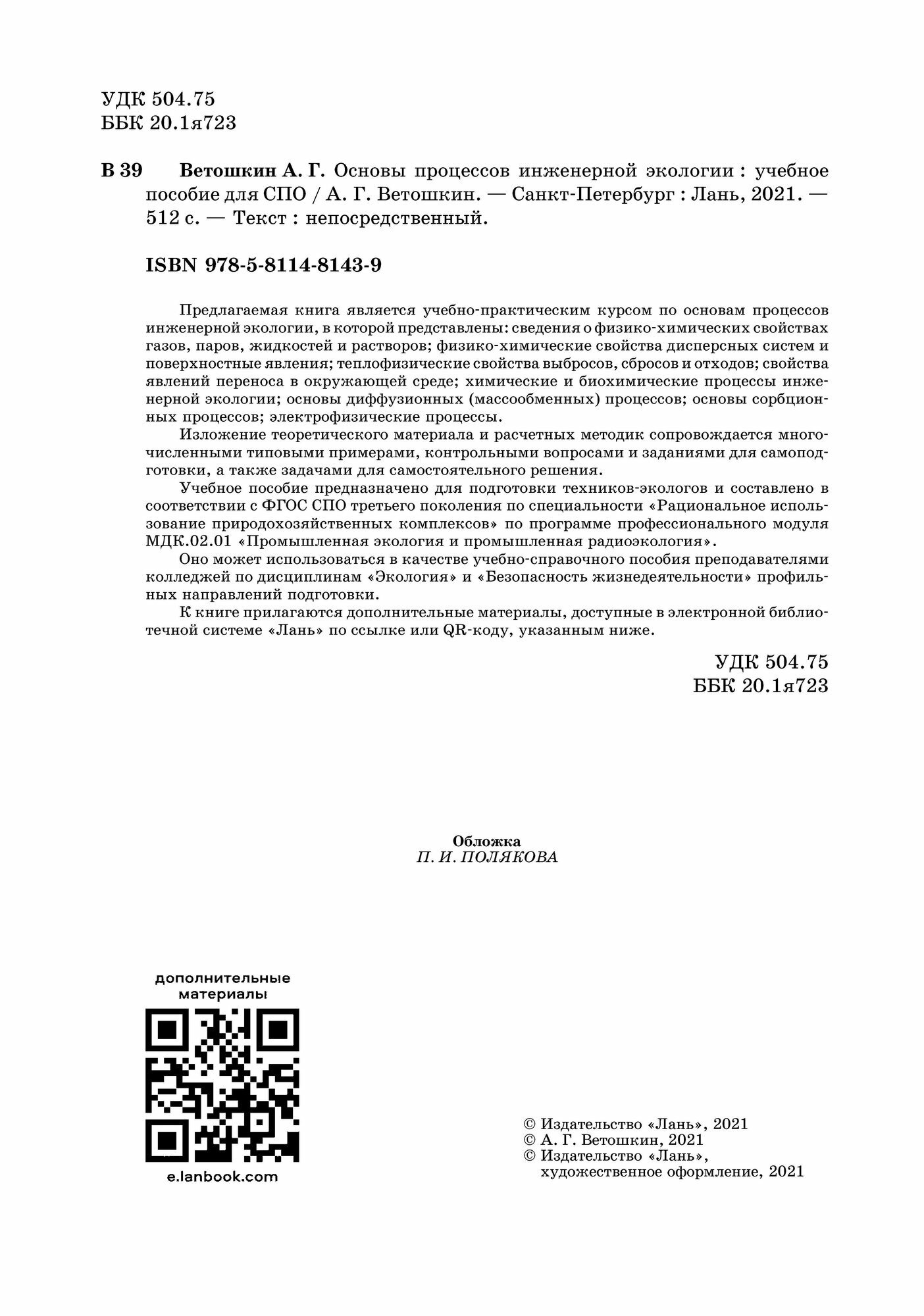 Основы процессов инженерной экологии Учебное пособие для СПО Электронное приложение (А. Г. Ветошкин); Издательство ЛАНЬ, 2021